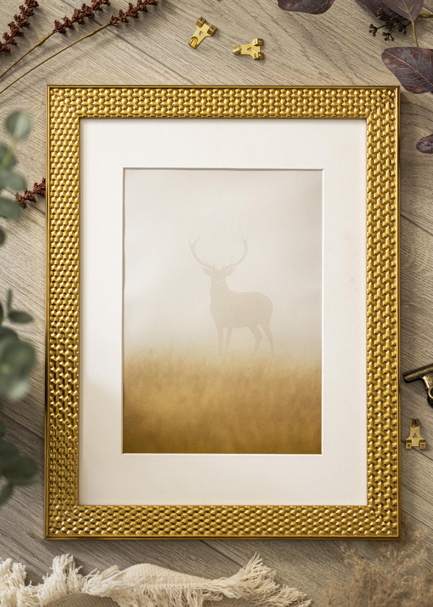 Fedezze fel az elegáns báját a retro stílusú, 18x24 cm-es arany keretünknek, egy fényképkeret, amely azonnal klasszikus szépséget kölcsönöz otthonának. A 35 mm széles keretléce lenyűgöző jelenlétet és mélységet kölcsönöz a kiválasztott műalkotásnak vagy fényképnek.