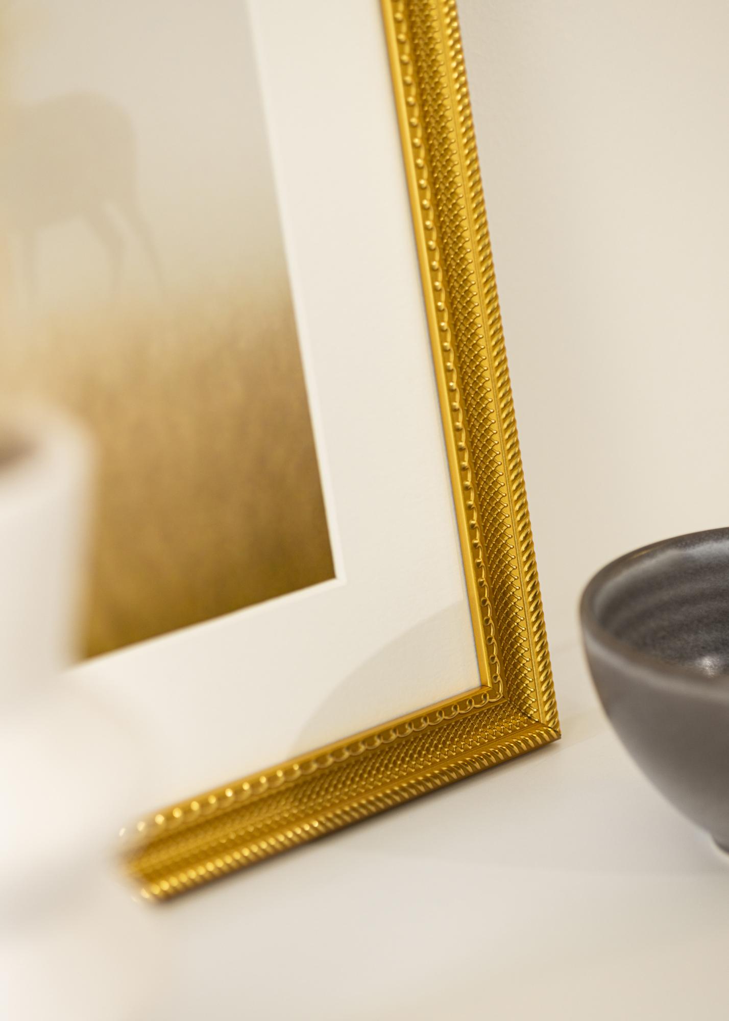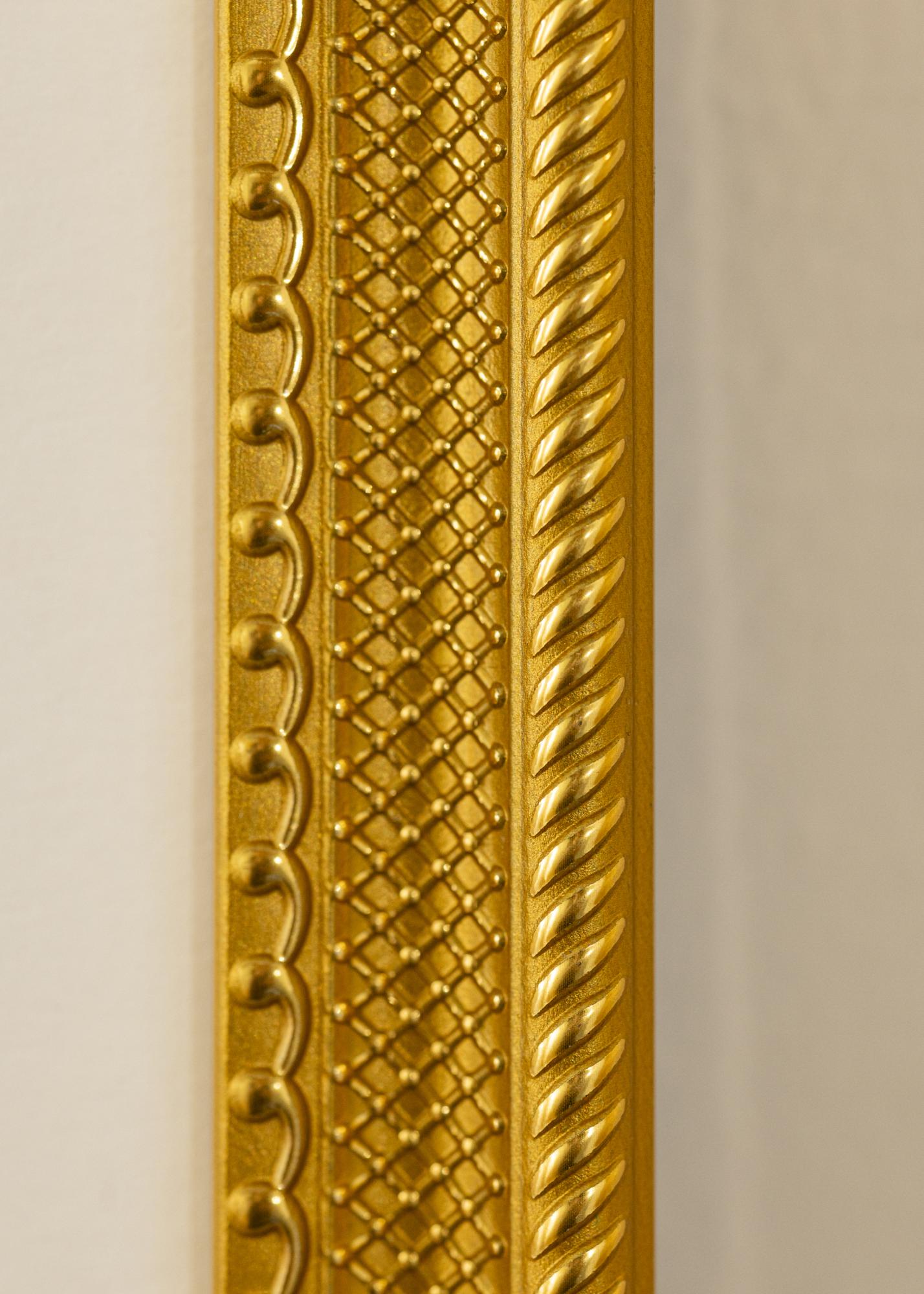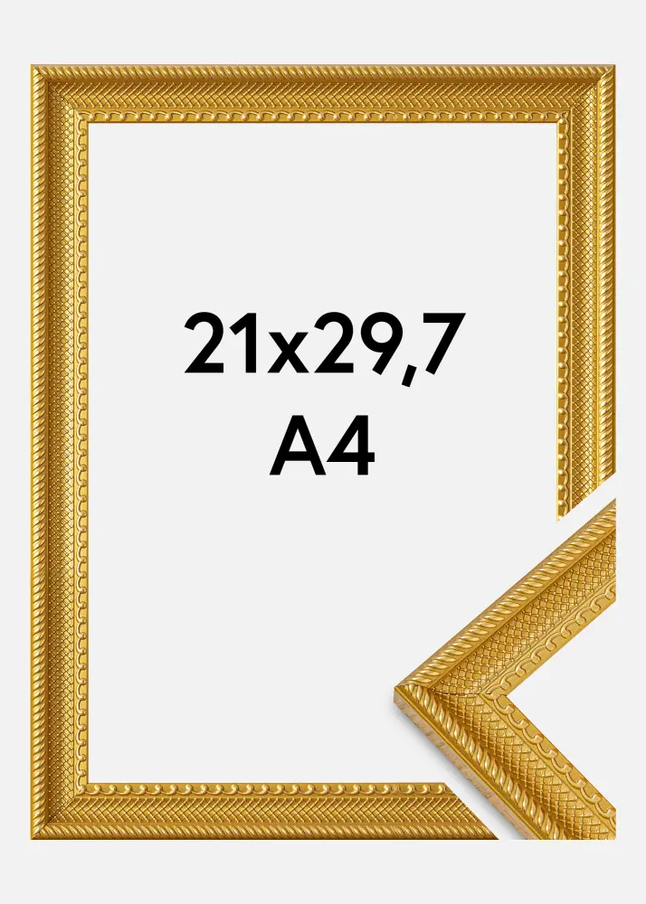 Ez az elegáns arany képkeret a klasszikus design és a modern funkcionalitás tökéletes kombinációja. Részletes mintáival a széleken és fényes felületével luxusérzetet kölcsönöz, amely minden műalkotást vagy fényképet feldob. A keret kompozit anyagból készült, amely erőt és könnyedséget biztosít számára. Úgy van tervezve, hogy a 21x29,7 cm-es (A4) méretű képeket befogadja, így ideális választás kedvenc emlékeid stílusos megjelenítésére.