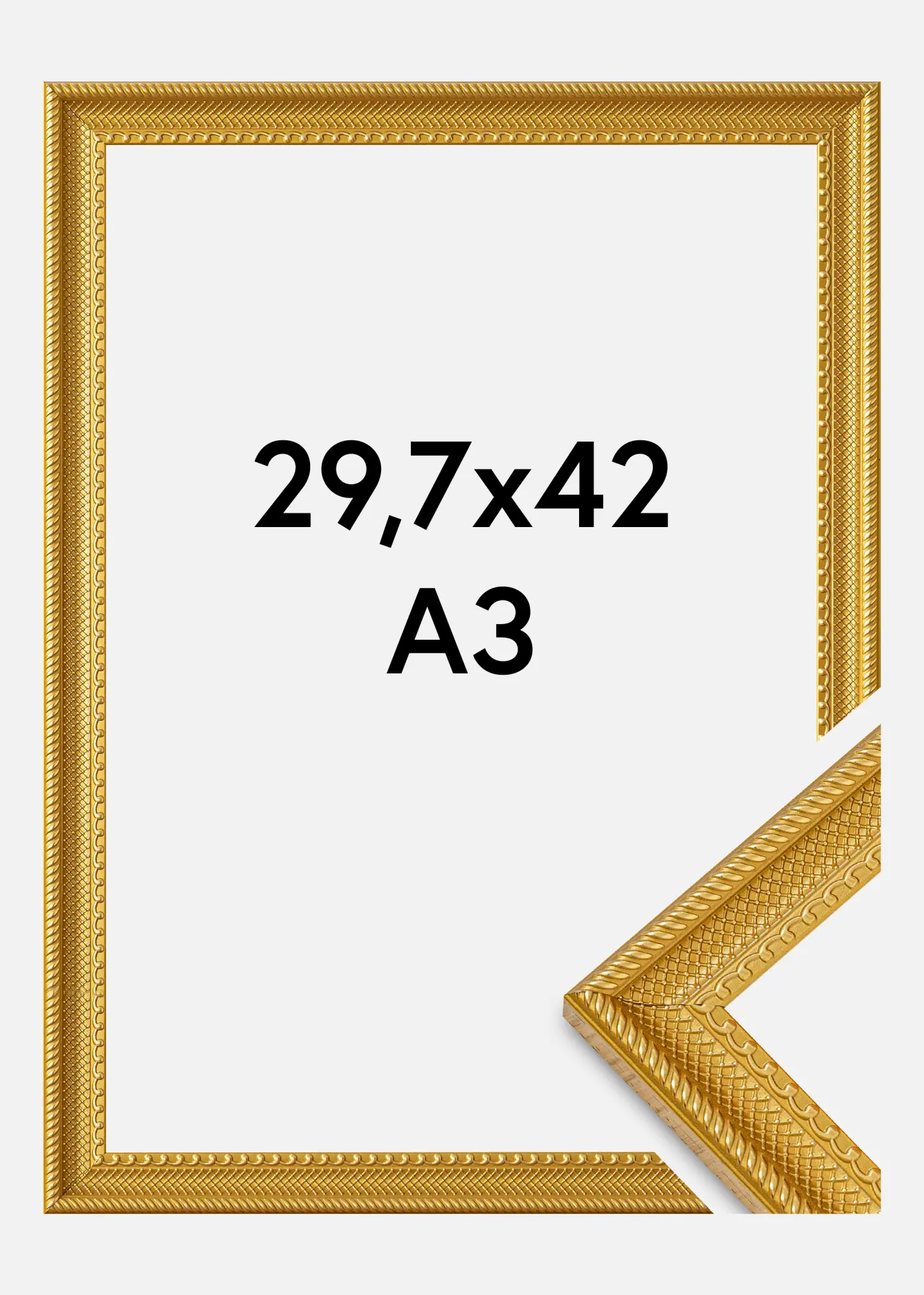 Ez az elegáns arany képkeret a klasszikus design és a modern funkcionalitás tökéletes kombinációja. A széleken lévő részletes mintázat luxusérzetet kölcsönöz, amely kiemeli minden műalkotás vagy fénykép szépségét. A keret összetett anyagból készült, ami robusztus és tartós szerkezetet biztosít. Úgy tervezték, hogy 29,7x42 cm-es (A3) motívumokhoz illeszkedjen, így ideális arra, hogy stílusosan bemutassa kedvenc emlékeit.