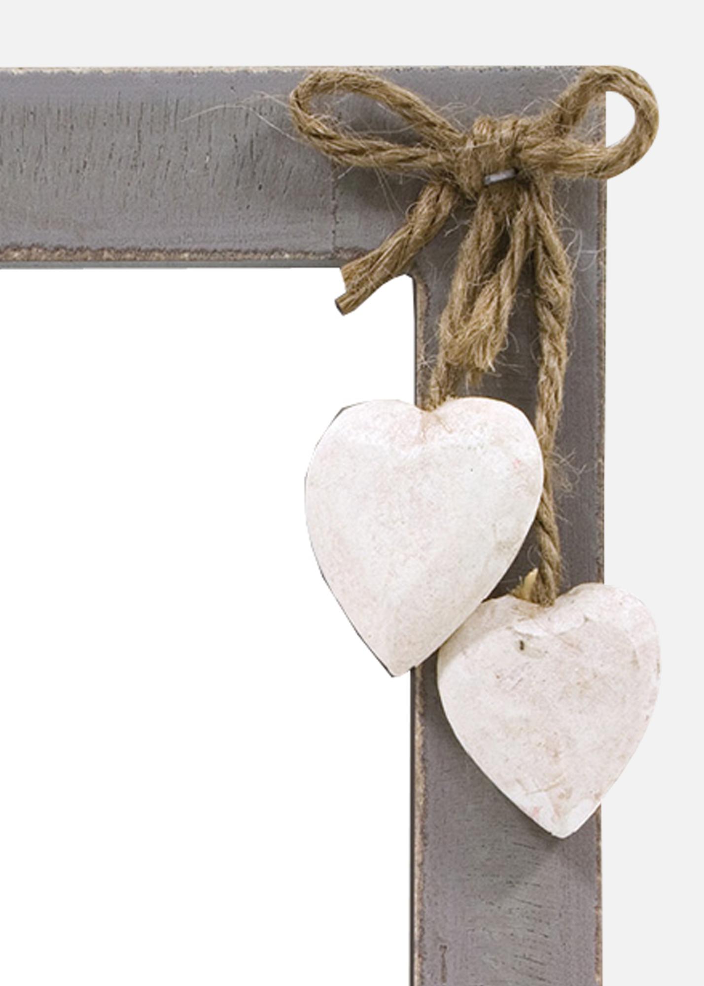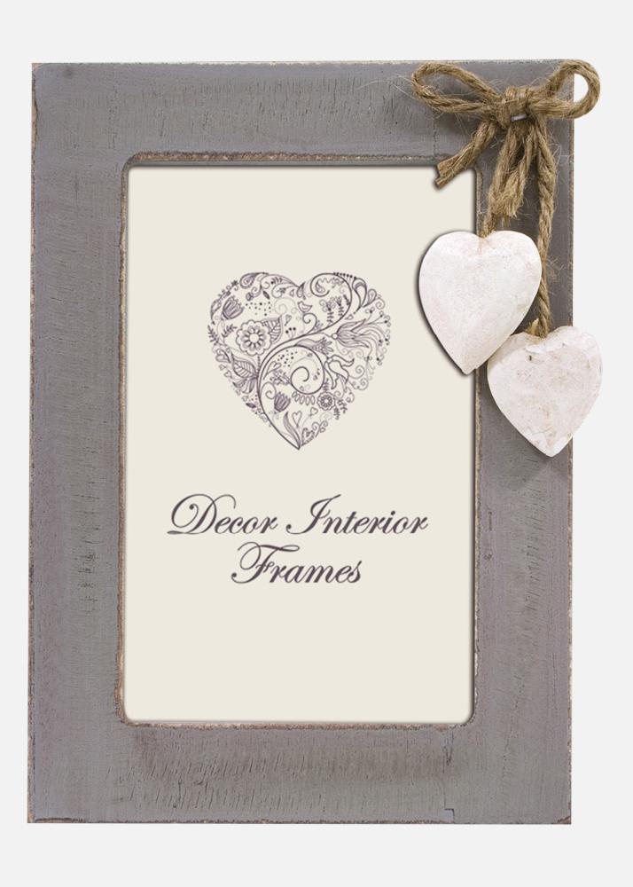 Egy bájos képkeret rusztikus érzettel, szürke árnyalatú felülettel. Két szív alakú fa medállal és természetes kötéllel díszítve a romantikus és vidéki hangulatért. Tökéletes, hogy kiemelje a legkedvesebb emlékeket és meleg légkört teremtsen az otthonban.