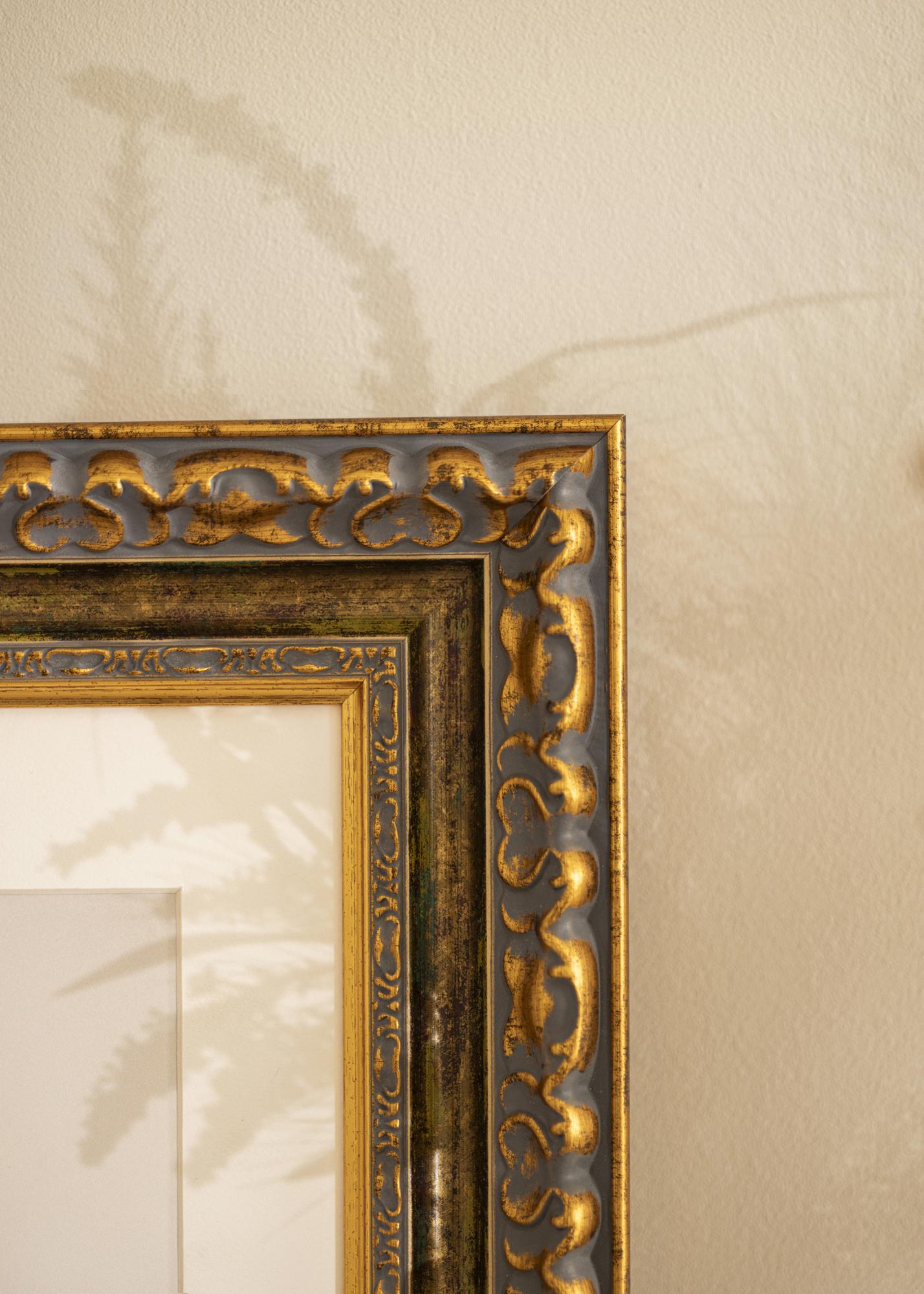 Szeretnél összeállítani egy gyönyörű képet egy régi családi fotóval vagy egy szép családi képpel? Akkor itt van egy luxus keretünk, amely karaktert ad, és magára vonzza a figyelmet! A keret finoman koptatott, a minták arany és szürke, illetve arany, zöld és barna színekben váltakoznak. Mivel saját keretműhelyünkben készítjük, biztos lehetsz benne, hogy kiváló minőségű képkeretet kapsz.