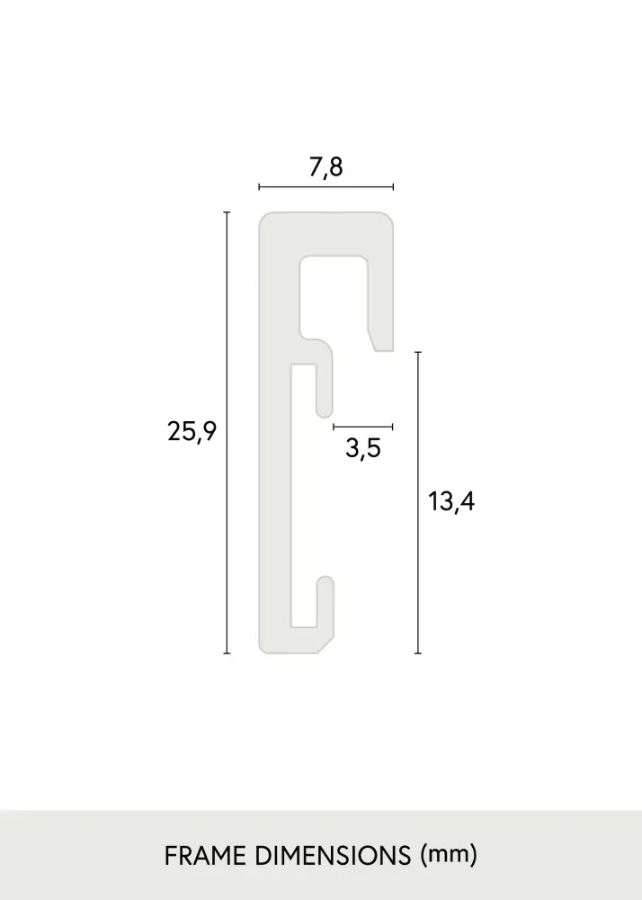 A keretet saját keretműhelyünkben gyártjuk, a Nielsen egyik legszebb és legvékonyabb alumíniumprofiljából, valódi tükröződésmentes üveggel a Tru Vue-tól, amely karcálló és 70%-os UV-védelemmel rendelkezik. A fekete keret fényes és mindössze 7,8 mm széles.