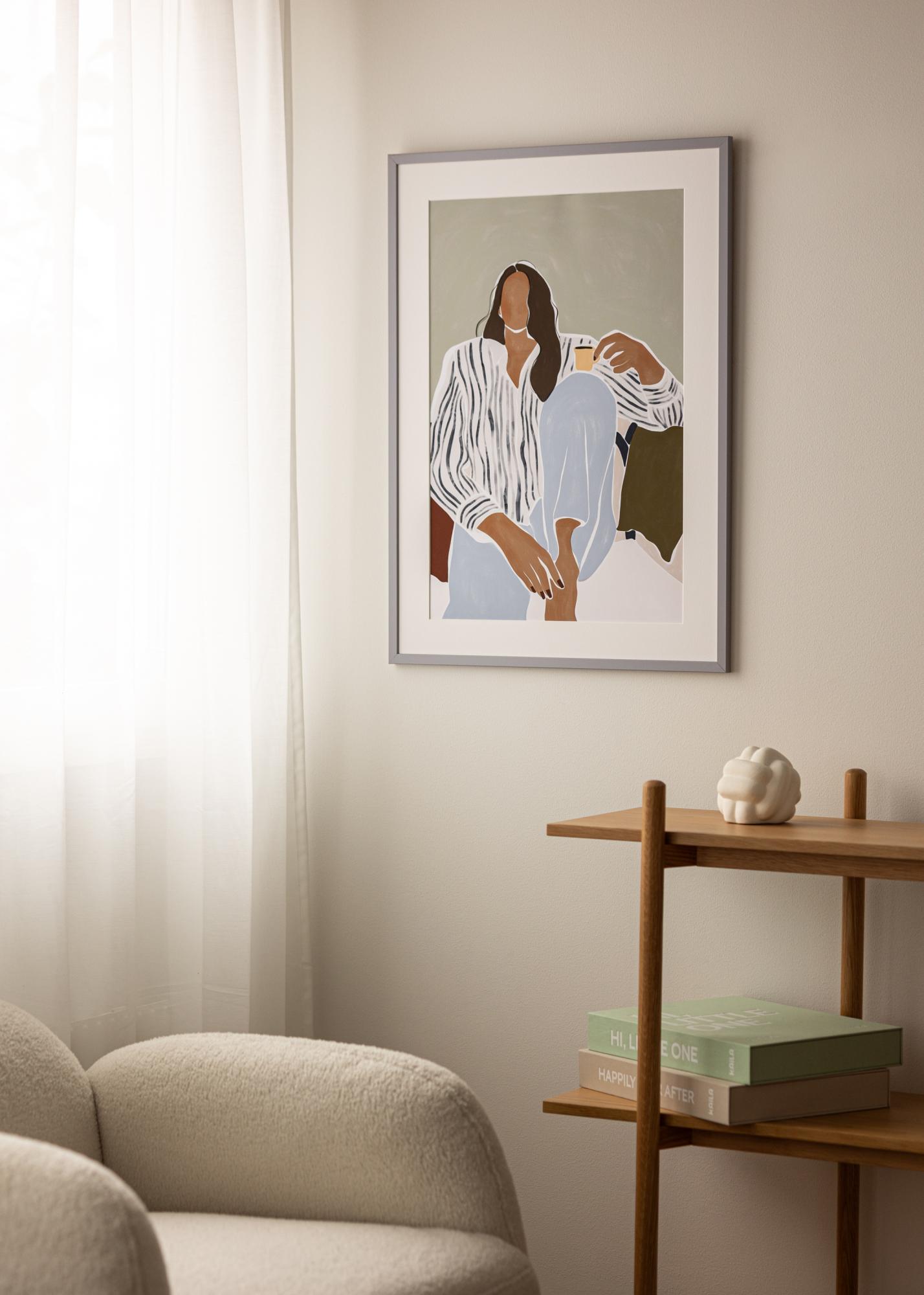 A képkeret valódi üveggel van ellátva, hátlapja pedig stabil, barna MDF-ből készült. A keret egy mozgatható fali akasztóval is rendelkezik, amely lehetővé teszi, hogy a falon függőlegesen és vízszintesen is elhelyezd. A motívum rögzítése egyszerűen történik úgy, hogy a fémkapcsokat meghajlítod, amelyek a hátlapot helyén tartják, és a képet a keretbe helyezed.