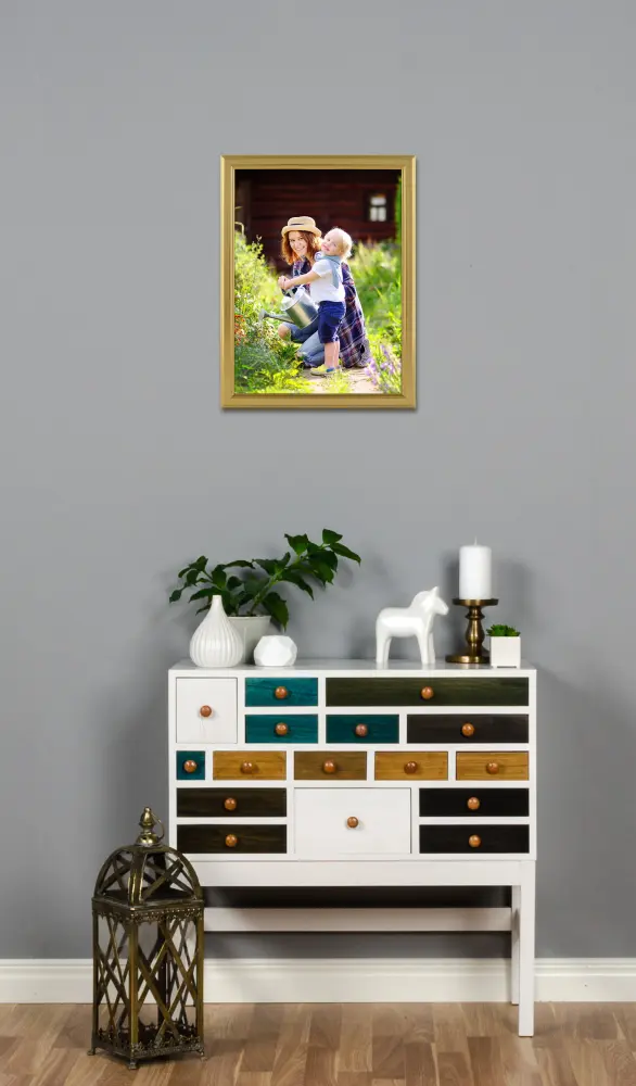 Ez a méretre gyártott keret 24 mm széles szegéllyel és 30 mm mély profillal rendelkezik, amely stabil és masszív keretezést biztosít. Fenyőből készült, egyszerre tartós és esztétikus. A keret arany színe meleg és hívogató légkört teremt, amely ideális a legkedvesebb képek vagy műalkotások kiemelésére.