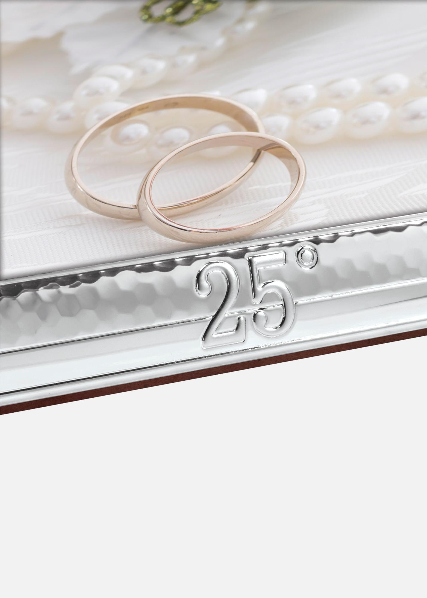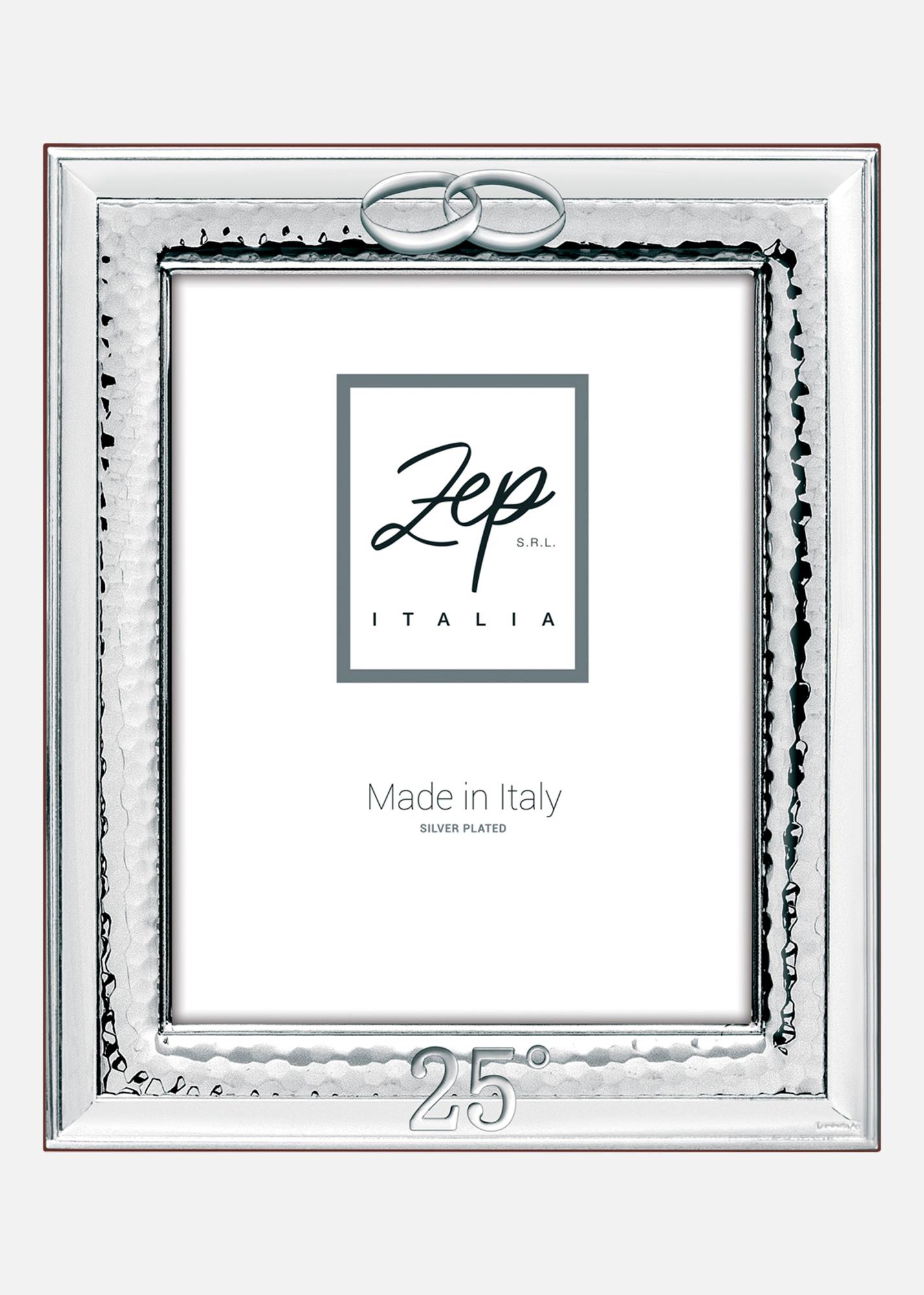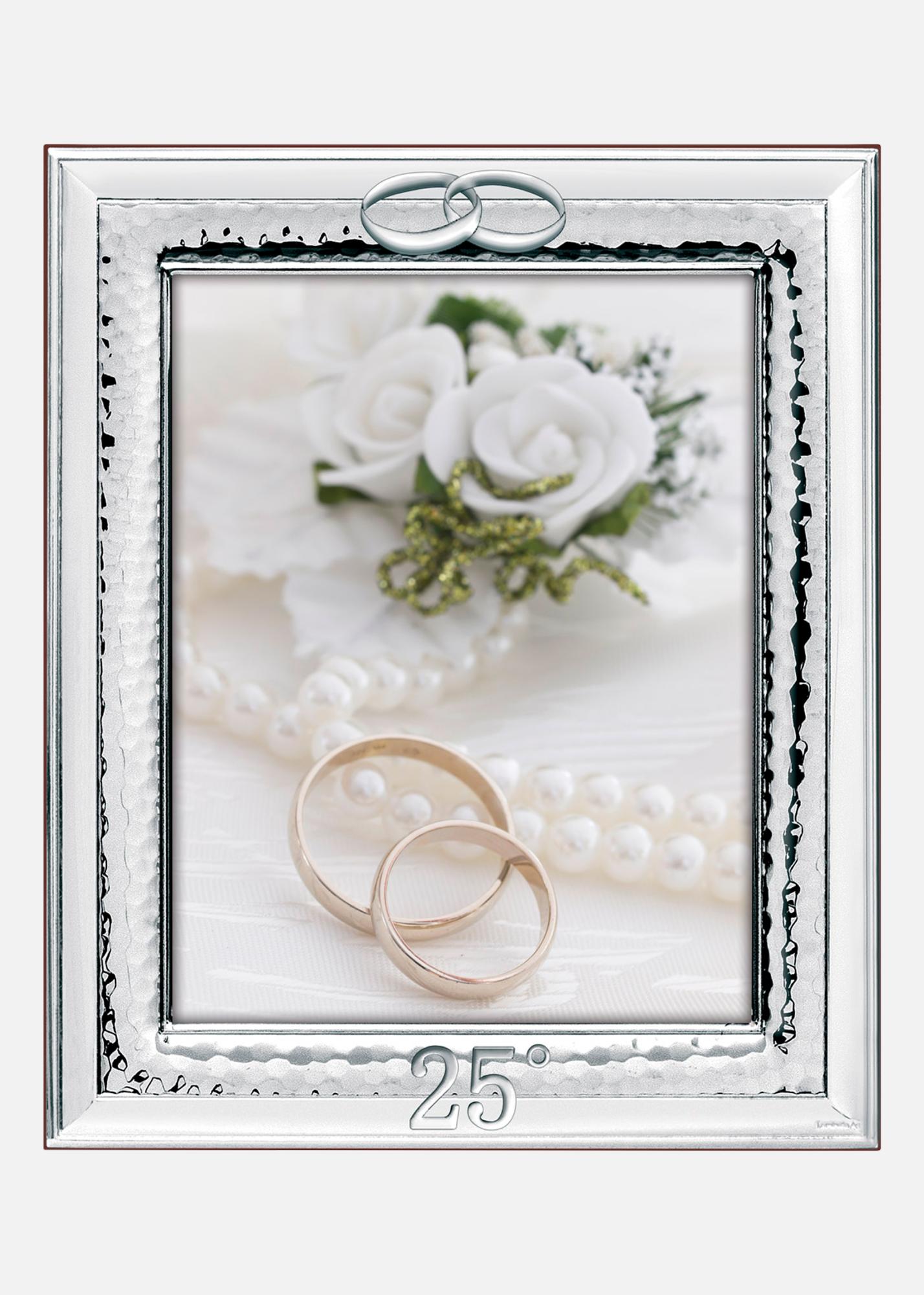 Elegáns ezüstözött képkeret esküvői témával. A tetején összekapcsolt gyűrűk és alul a "25°" szám tökéletessé teszik egy 25 éves évforduló, például egy ezüstlakodalom megünneplésére.