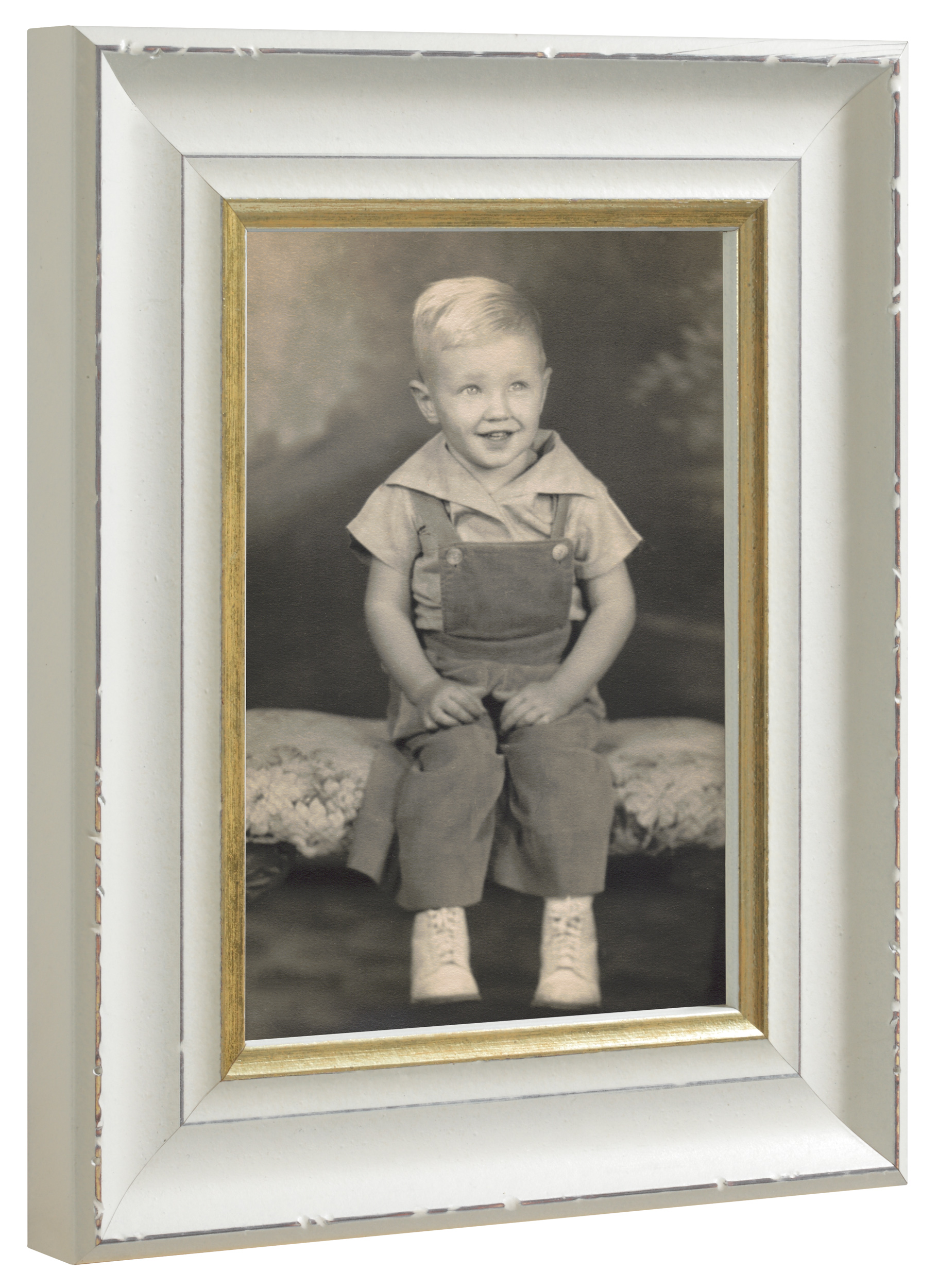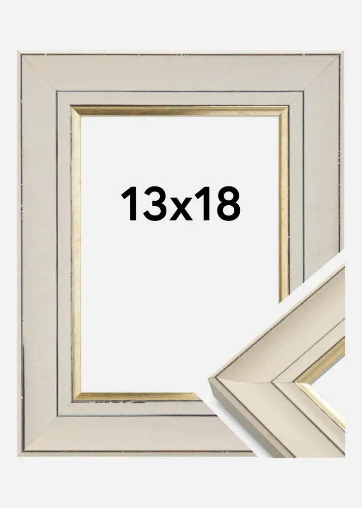 Klasszikus stílusú képkeret izgalmas retro hangulattal. A keret kopott profilja fehér, elegáns arany szegéllyel a motívum közelében, semleges designjának és színválasztásának köszönhetően ez egy keret, amely szinte minden környezetben és mindenféle motívumhoz illik.