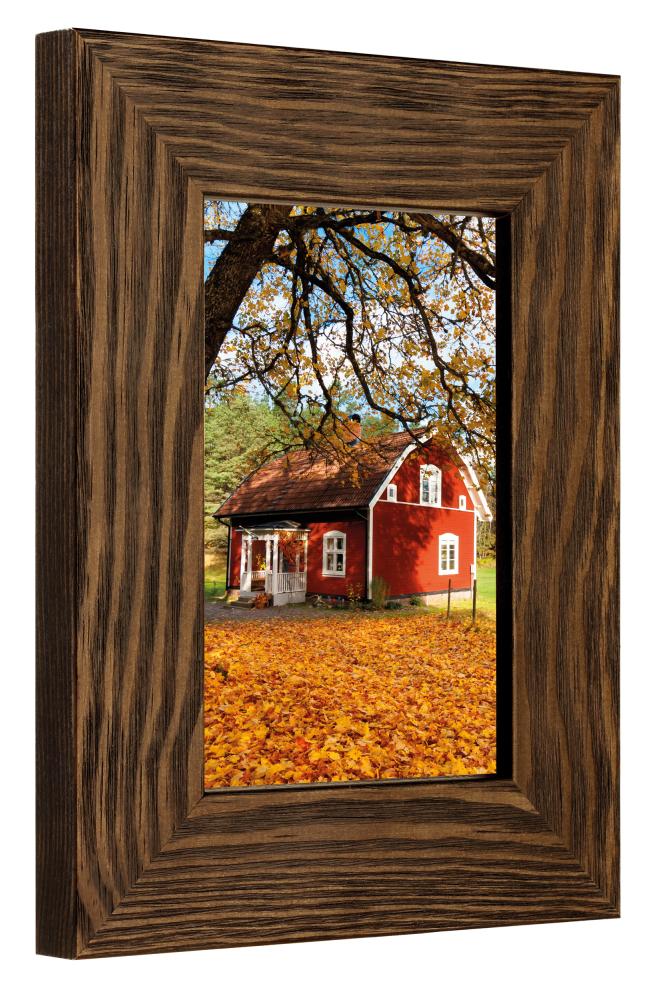 Masszív barna fakeret látható faerezetekkel, széles profillal. Jól illeszkedik, amikor sötét fakeretre van szükség természetes érzettel. Tökéletes környezetképekhez és tájképekhez.