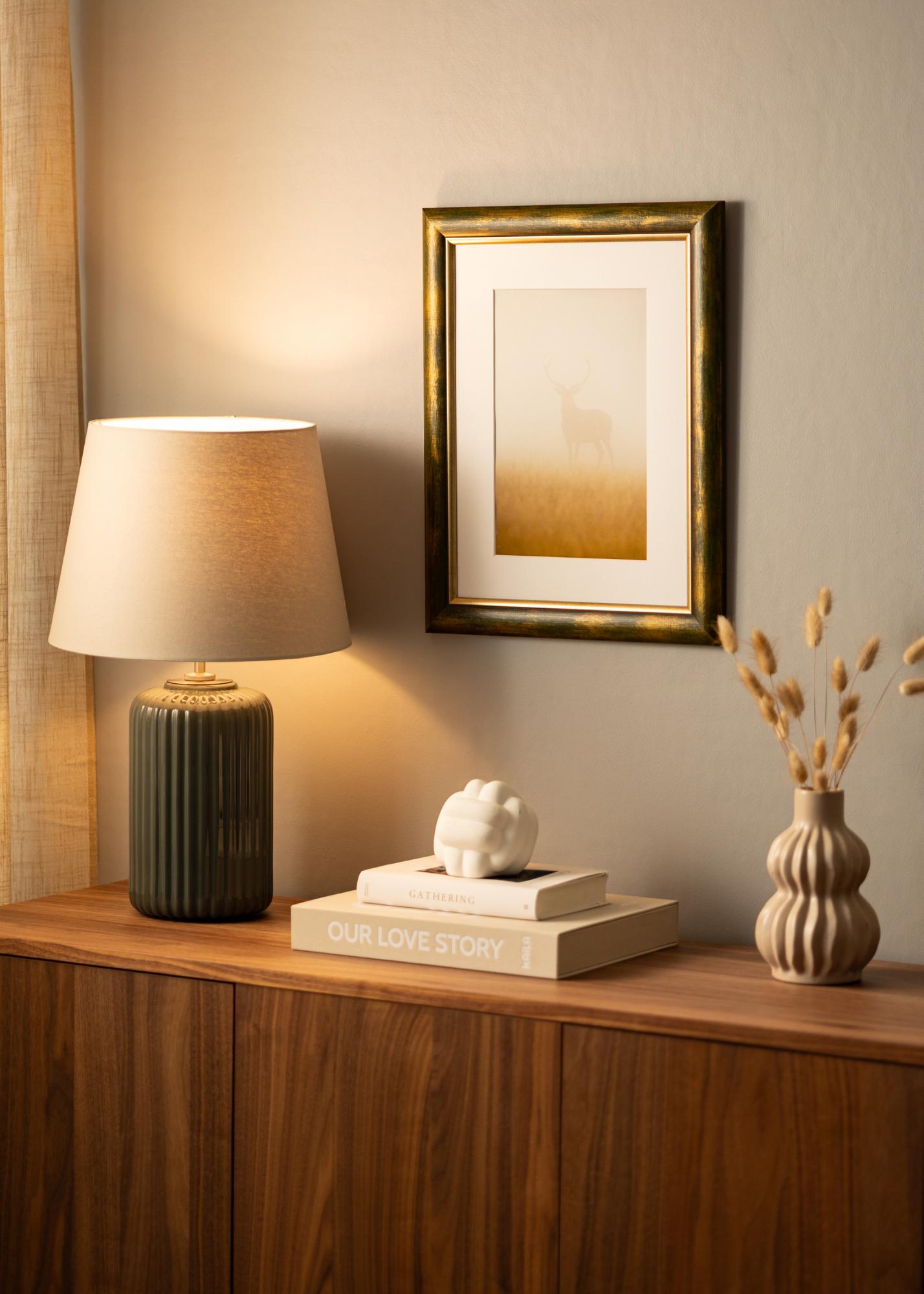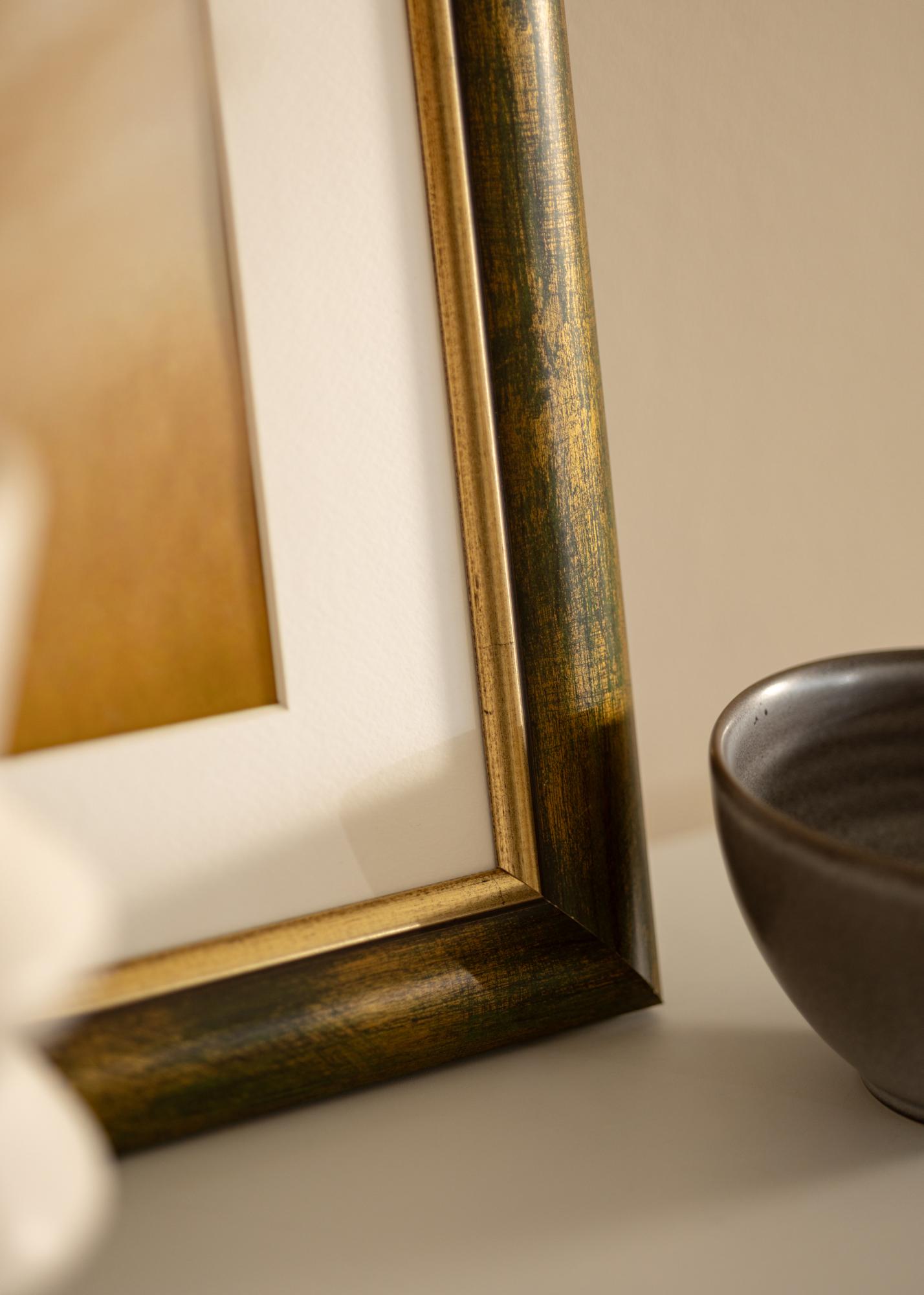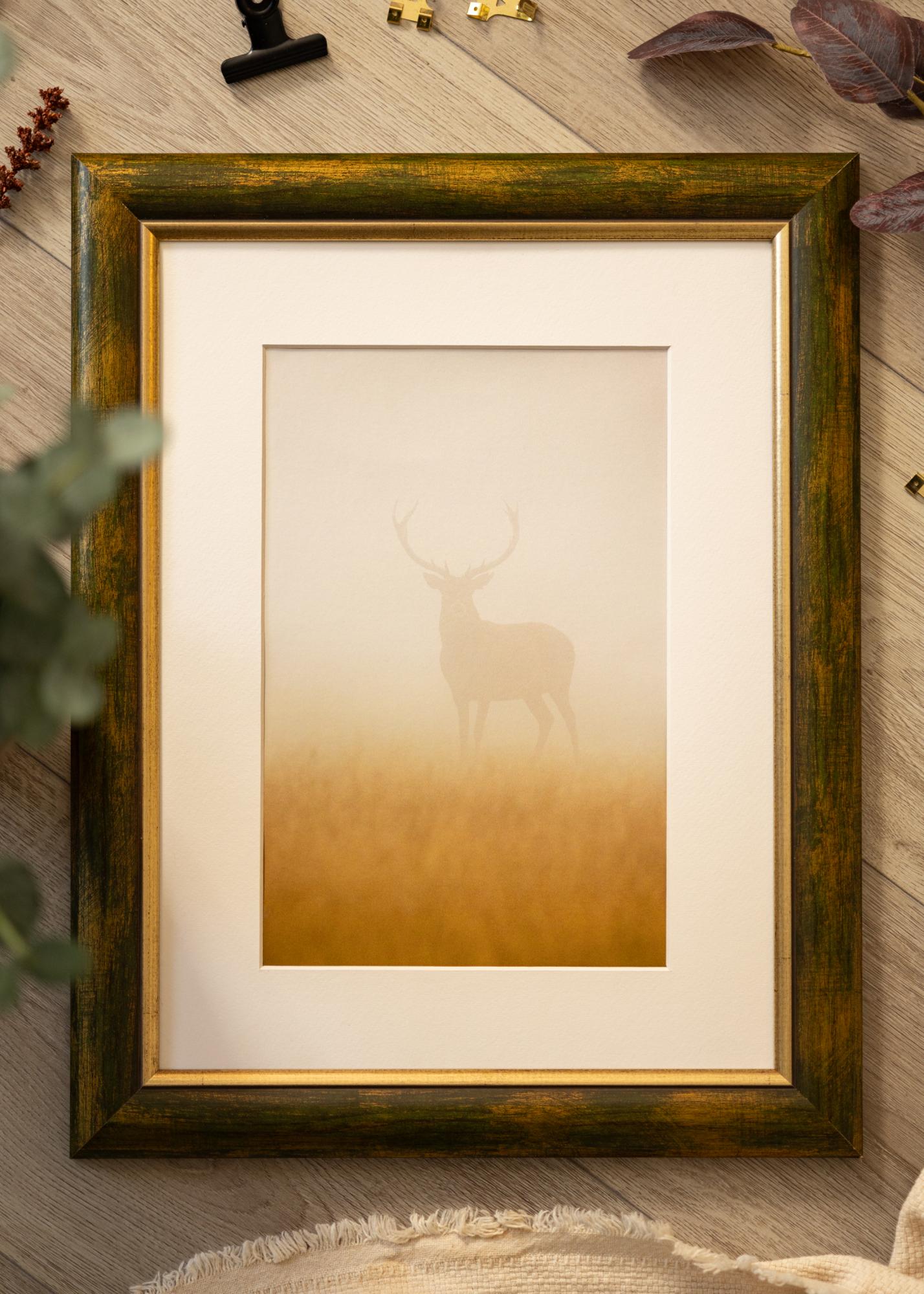 Időtlen fa keret, Finnországban készült, divatos zöldes fa felülettel és arany szegéllyel a motívum mellett. Harmonikus érzést kölcsönöz a motívumnak. A keret teljes egészében 41 mm széles profillal és 19 mm mélységgel rendelkezik, ami extra mélységet ad a bekeretezésnek.