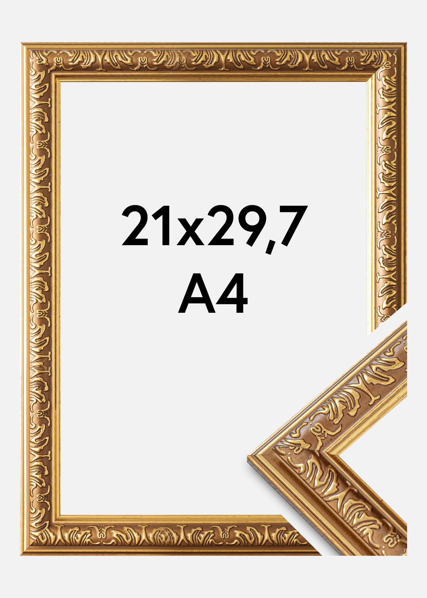 Ez a 21x29,7 cm-es (A4) méretű képkeret a klasszikus elegancia és a modern funkcionalitás tökéletes kombinációja. A luxus arany bevonatával és dekoratív, díszített részleteivel kifinomultságot kölcsönöz bármely műalkotásnak vagy fényképnek. A keret belső szélén található bonyolult minták hagyományos és időtálló érzést keltenek, ideálissá téve mind klasszikus, mind elegáns belső terekhez.