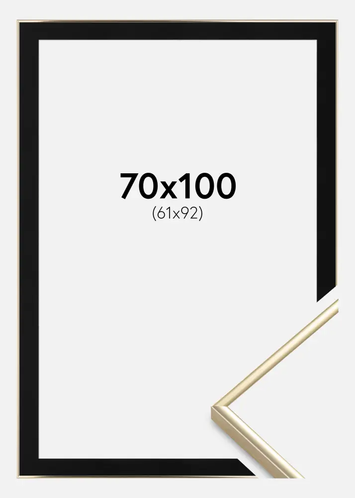 Élje át azt a luxust, hogy bekeretezheti kedvenc képeit elegáns arany keretünkkel, fekete paszpartuval. Ez a kifinomult keret tökéletes műalkotások vagy fényképek kiemelésére 62x93 cm méretben. Fényes felületével és ízléses 6,5 mm-es profil szélességével különleges megjelenést kölcsönöz a faldekorációjának.