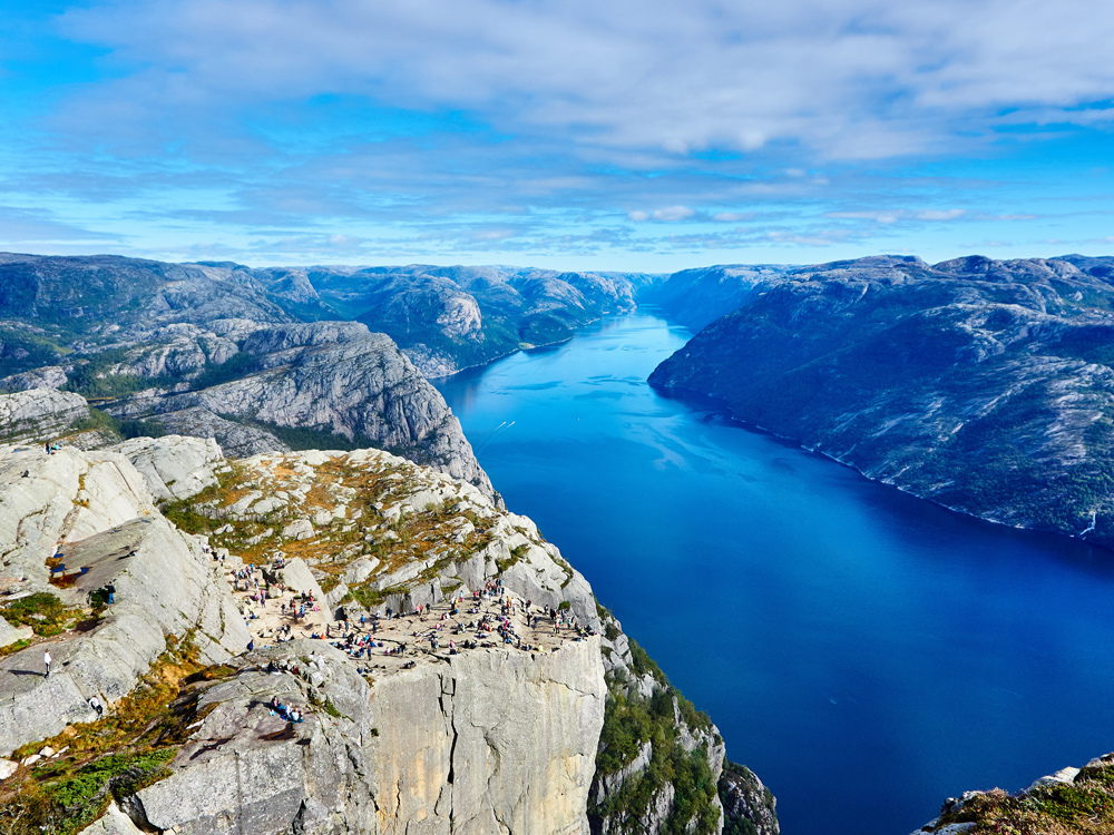 Fotó egy mérföldnyi lélegzetelállító kilátásról egy mély fjordvölgy felett. A poszter tengeri kék árnyalatokban pompázik, a fjord mindkét oldalán napsütötte, kopár sziklákkal, egy lenyűgöző táj, amely a természeti jeleneteket kedvelők falán jól mutat. Egészítse ki a képet egy olyan képkerettel, amely kiemeli a motívumot.