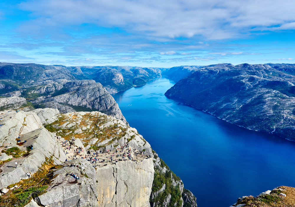 Fénykép mérföldekre nyúló, lélegzetelállító kilátással egy mély fjordvölgyre. A poszter tengerkék tónusokban pompázik, mindkét oldalon napsütötte kopár sziklákkal a fjord mellett, egy nagyszerű táj, amely illik annak falára, aki értékeli a gyönyörű természeti jeleneteket. Egészítse ki a képet olyan képkerettel, amely kiemeli a motívumot.
