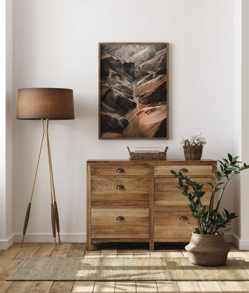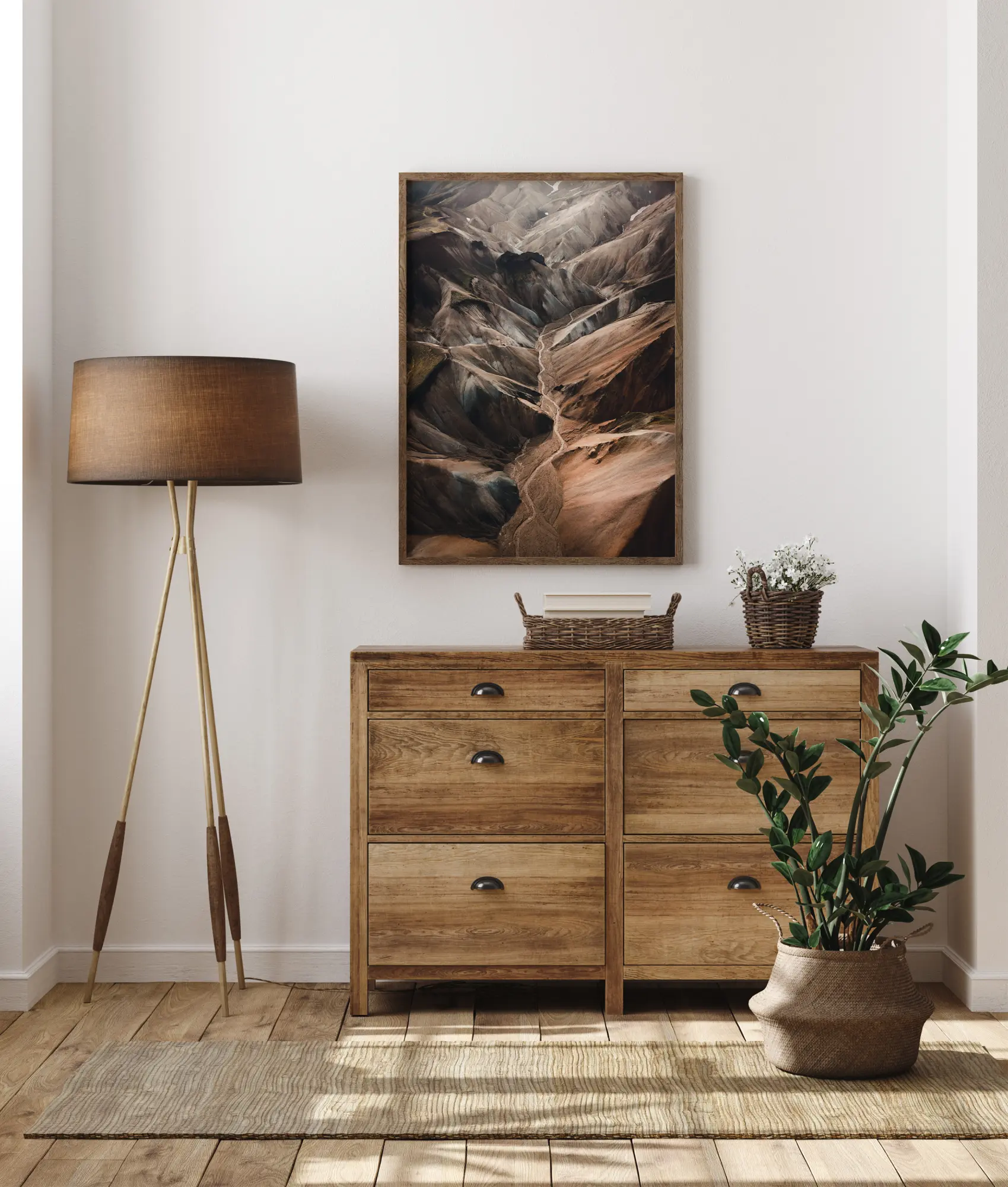 Egy látványos hegyi nyomat a levegőből, a színes Ryholite-hegységgel. A lágy őszi színek, barna tónusok melegséget árasztanak, és inspiráló posztert alkotnak, amelyet otthonába akaszthat. Kövesse a magányos ösvényt, és nézze meg, hová vezet ezen a gyönyörű természetes úton.