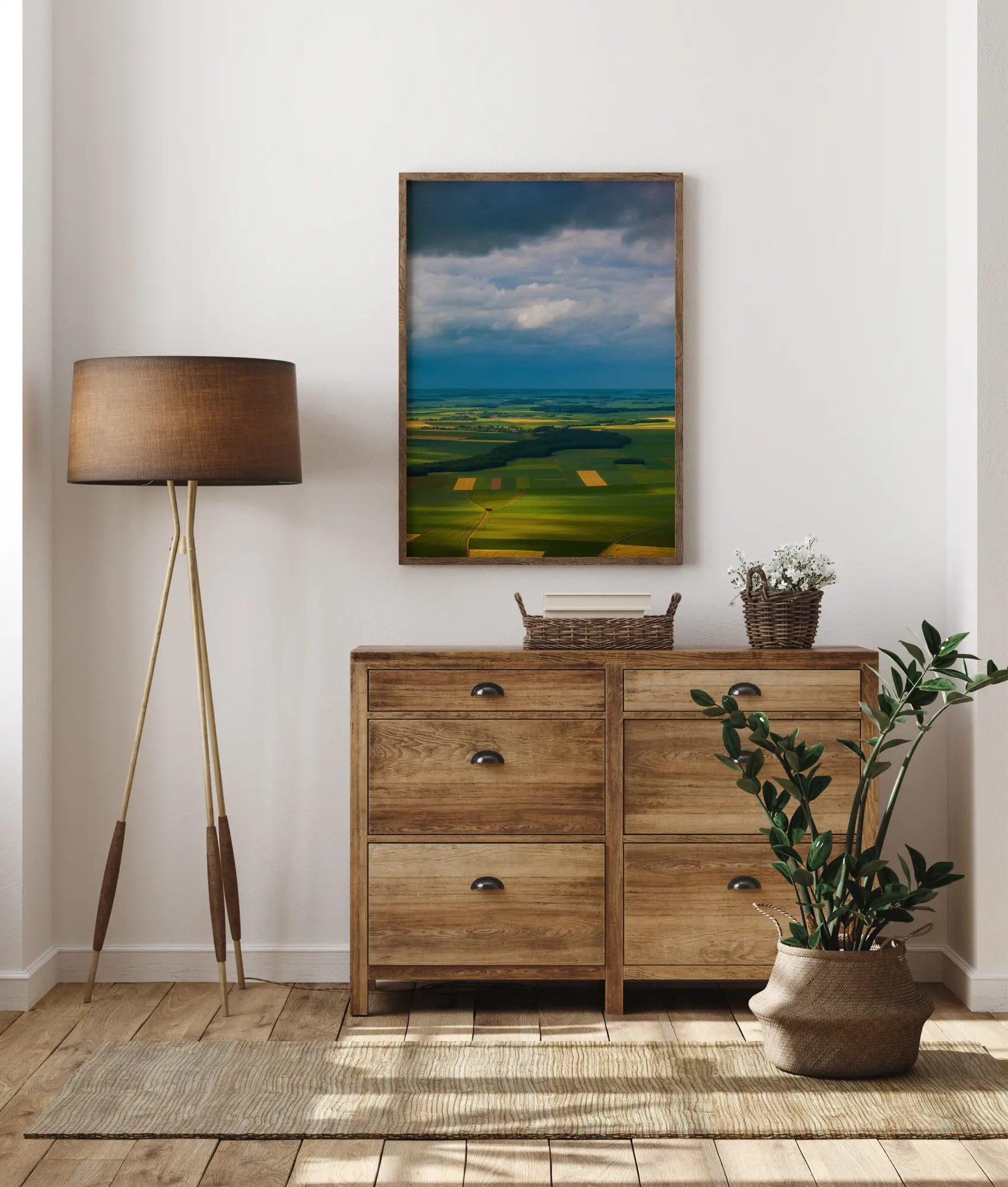 Egy fantasztikus tájposzter a vidékről. Különböző zöld és sárga árnyalatok meleg és idilli jelenetet alkotnak. A nap sugarai átsütnek a felhőkön, és különböző fényárnyalatokat hoznak létre a mezőkön. Érezze a friss levegőt ebben a varázslatos nyomatban.