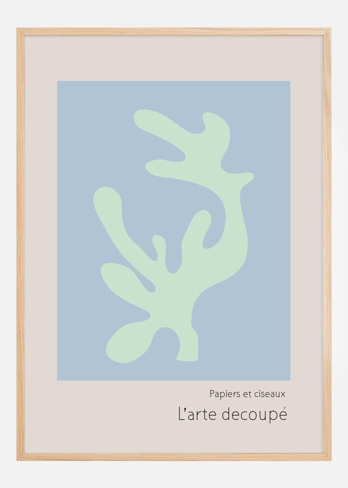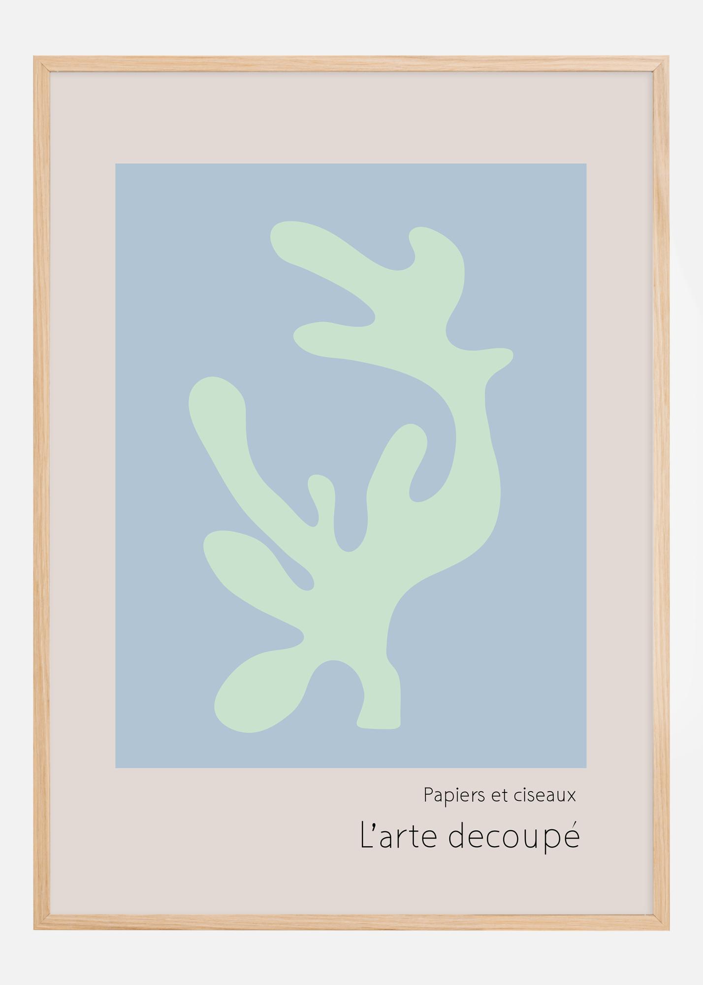 Ez a kifinomult és minimalista poszter tiszteleg a 'L'arte decoupé', a papírvágás művészete előtt, amely a művészi kifejezés egy elegáns és időtlen formája. Egy absztrakt formát ábrázol nyugtató pasztellzöld árnyalatban, amely egy lágy kék háttéren lebeg, könnyedség és mulandóság illúzióját keltve. Az egyszerű forma, amely egyszerre organikus és nyitott az értelmezésre, arra hívja a szemlélőt, hogy fedezze fel a negatív tereket, és találjon saját jelentést a kivágott mintában.