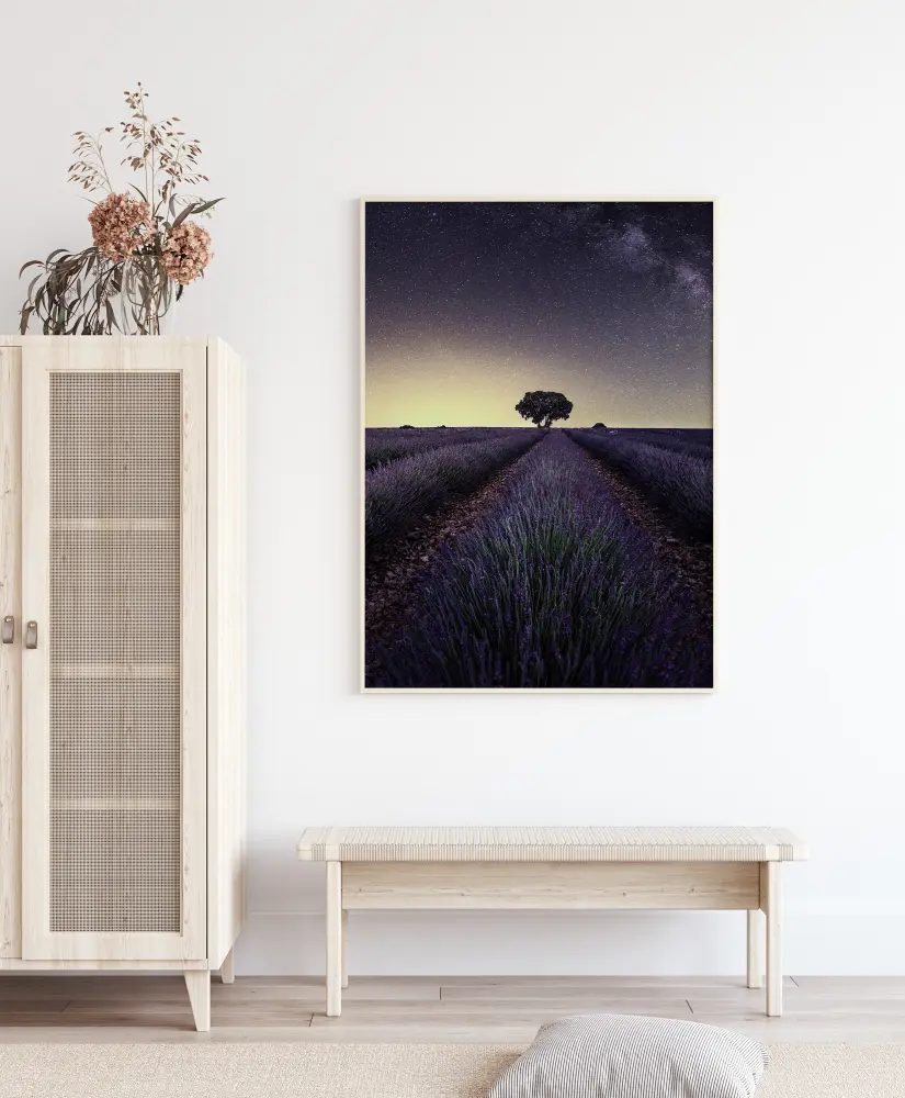 Egy teljesen elbűvölő poszter egy levendulamezőről. A lila levendula intenzív árnyalatai, amelyek tökéletesen illeszkednek egymáshoz, táncolnak a reggeli szellőben. Egy magányos fa ragyog az első hajnali napsütésben, kiegészítve a sötét csillagos égboltot. Akaszd ezt a nyomatot a konyhádba a természetes hangulatért.