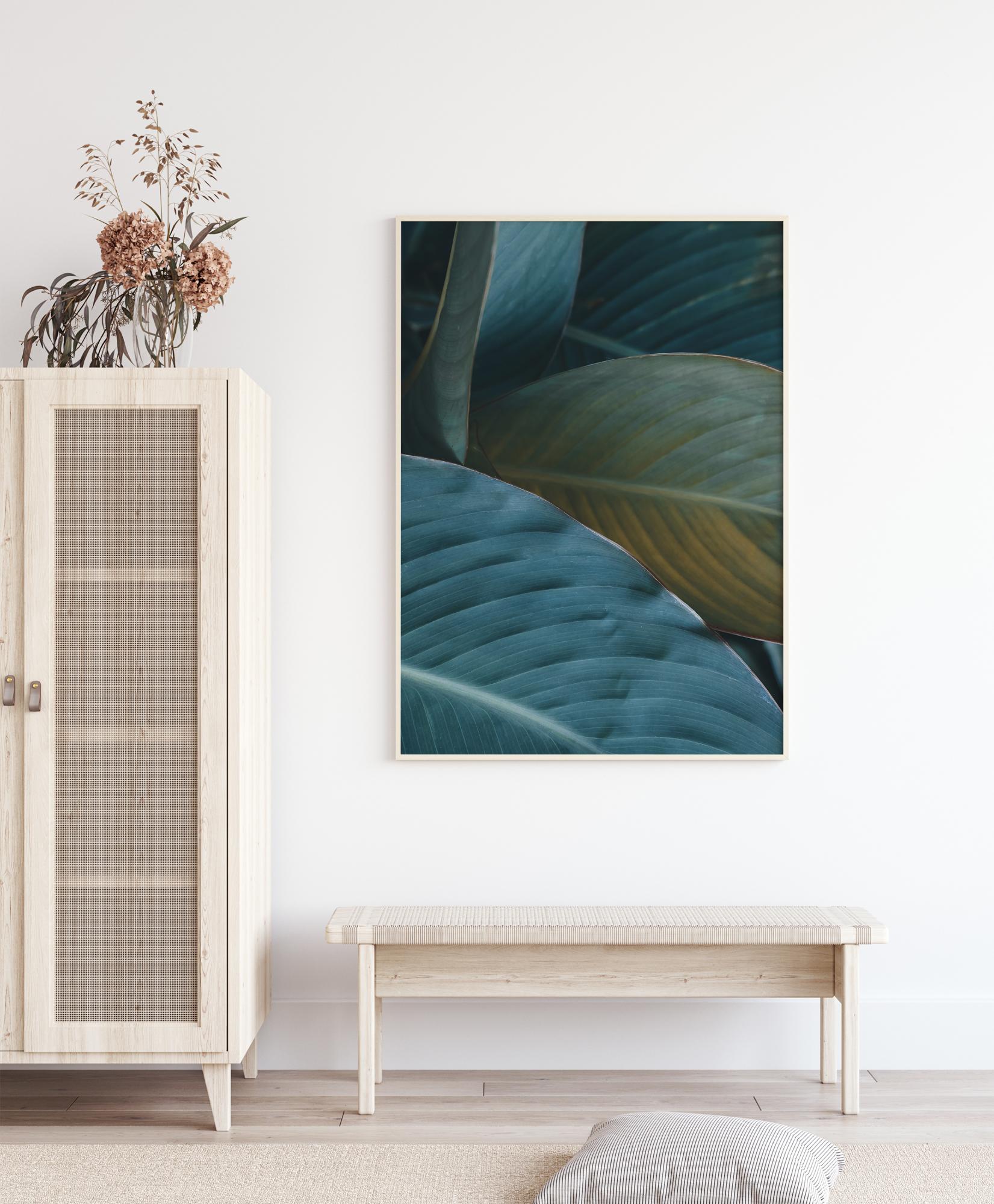 Közelkép egy levél nyomatáról. Ennek a poszternek az egyszerűsége a különböző zöld árnyalatokban tükröződik. A levelek közepe felé világosabbak. A természetes fény megvilágítja a széleket, aranyszínű megjelenést kölcsönözve a leveleknek. Gyönyörű nyomat, amelyet szívesen akasztana egy növényekkel teli szobába.