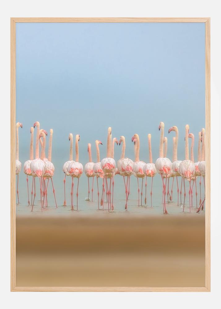 Egy látványos poszter egy flamingó csapatról a vízparton. A csodálatos lények hátulról vannak elkapva, és színüket a semleges ég- és homokszínek fokozzák. Tökéletes hálószobába helyezni, a fantáziát serkentő finomsága miatt.