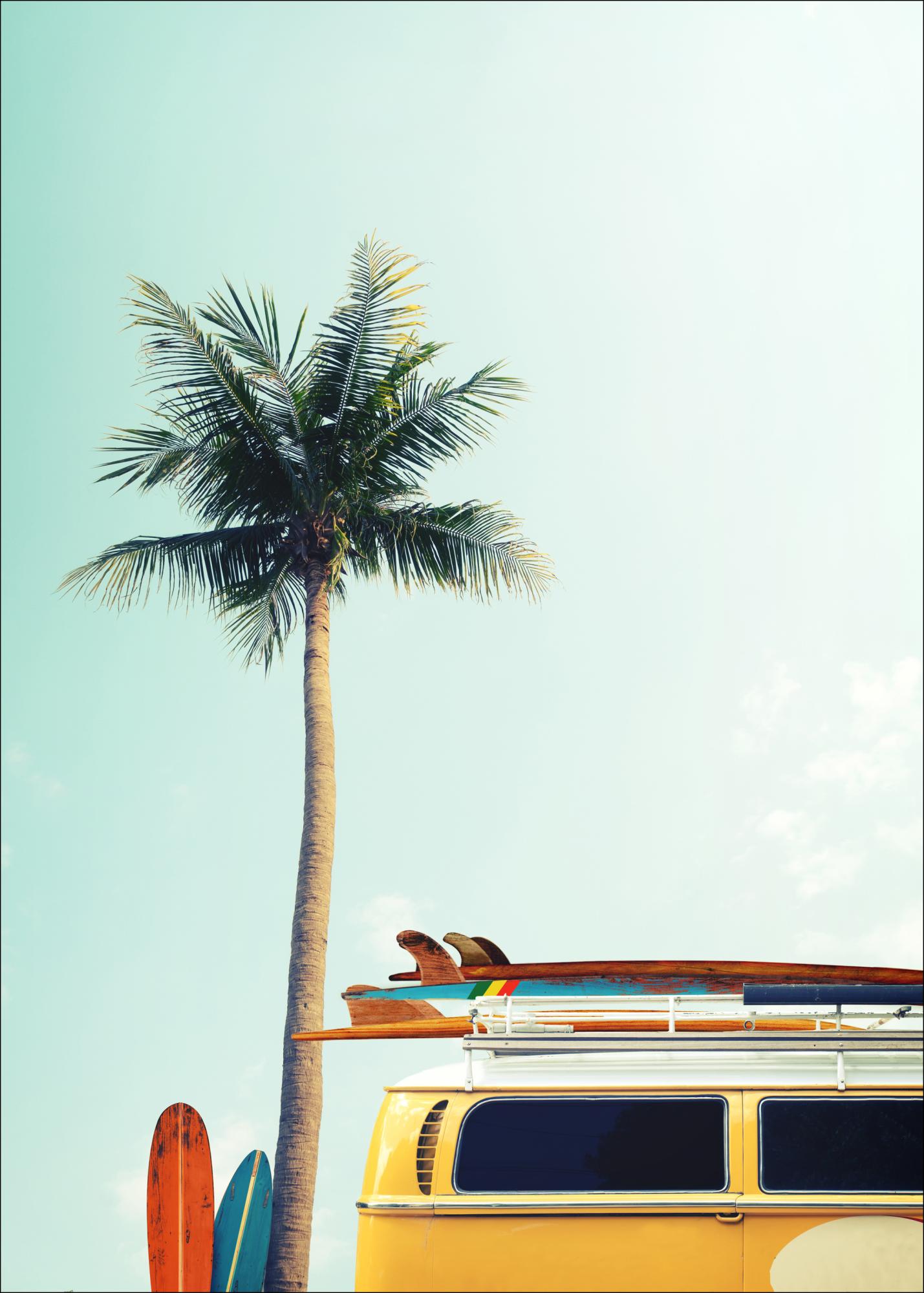 Egy fényképies poszter a klasszikus népautóval és szörfdeszkáival, parkolva egy pálmafa mellett felhőmentes ég alatt. Egy színes poszter, amely csodálatos nyári és szabadság érzést kölcsönöz. Kombinálja bátran más kedvenceivel egy nagyobb képfalon.