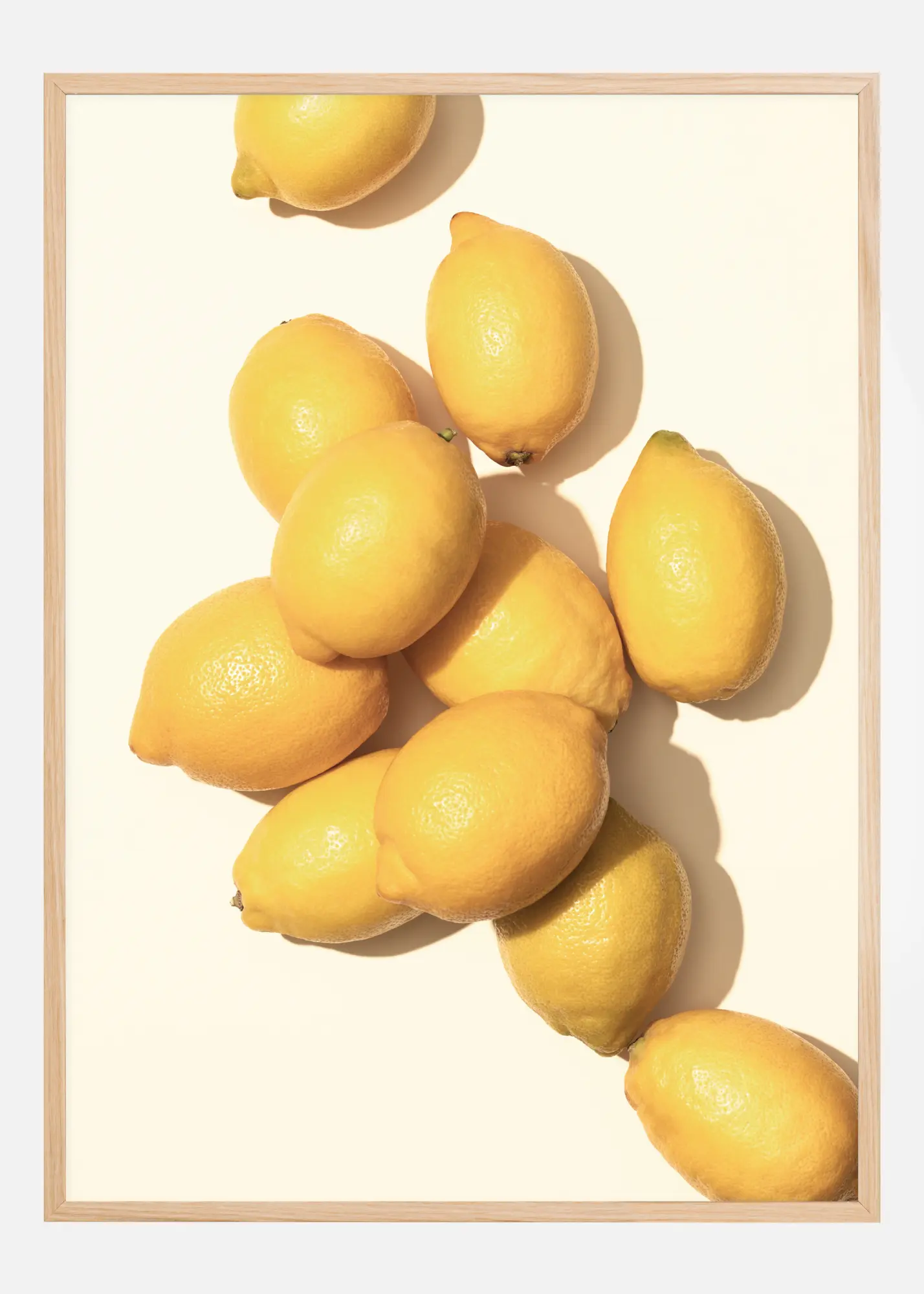 Valósághű poszter citromokról. A felülről jövő fény közvetlenül vetül a gyümölcsre, kiemelve a héj durvaságát. A fény árnyékokat vet, amelyek a fehér háttérre nyúlnak. Érezd ennek a citrusféle frissességének illatát, amikor ezt a nyomatot konyhádba akasztod fel.