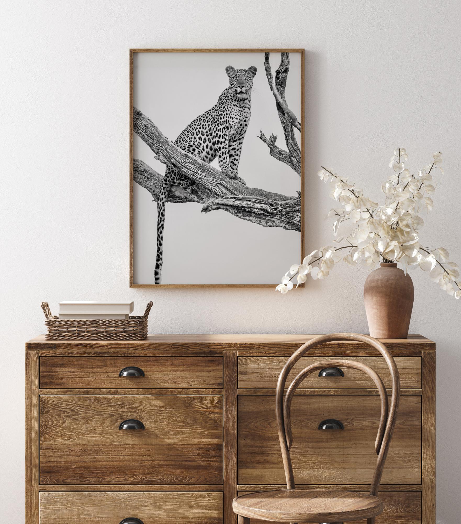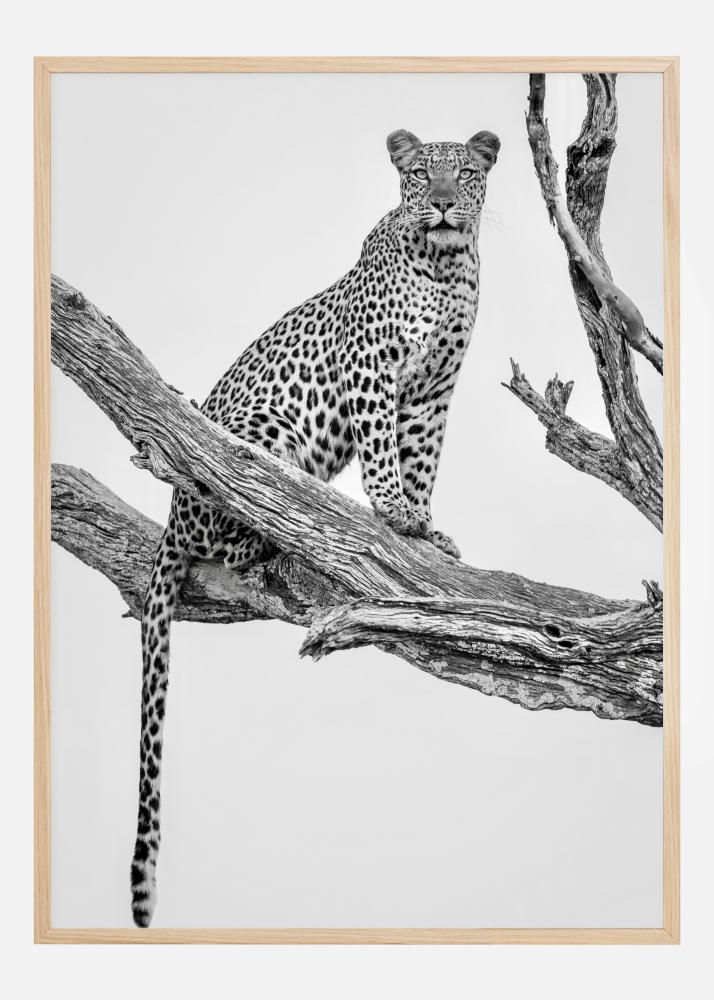 Egy természetposzter, amelyen egy leopárd ül, figyelve egy faágon. A leopárd távolba mered, és azt az érzést kelti, mintha valami történni fog. Érezze az izgalmat ezzel a nyomattal.