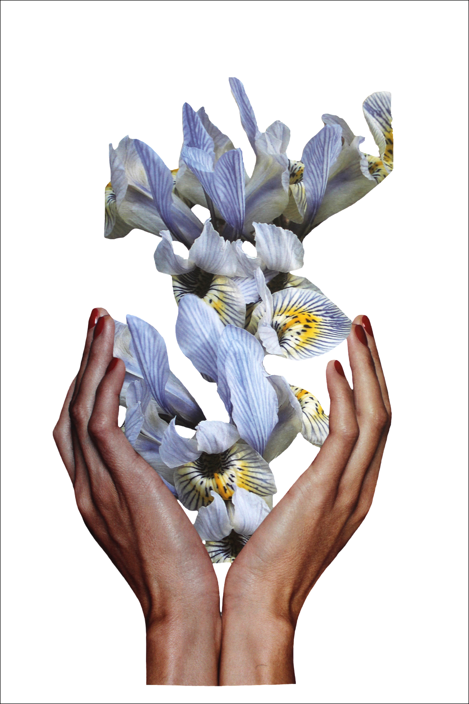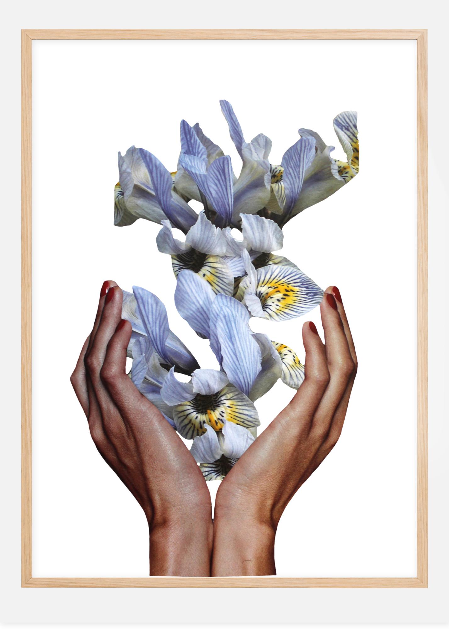 Egy gyönyörű virágos kép halványlila íriszekről. Finoman kinyújtott kezek gyönyörűen festett körmökkel óvatosan tartják az íriszeket. A fehér háttér kiemeli a lágy lila és sárga színeket, és finom, de gyönyörű virágos képet alkot. Egy pihentető poszter, amely életet ad egy egyszerű fehér falnak.