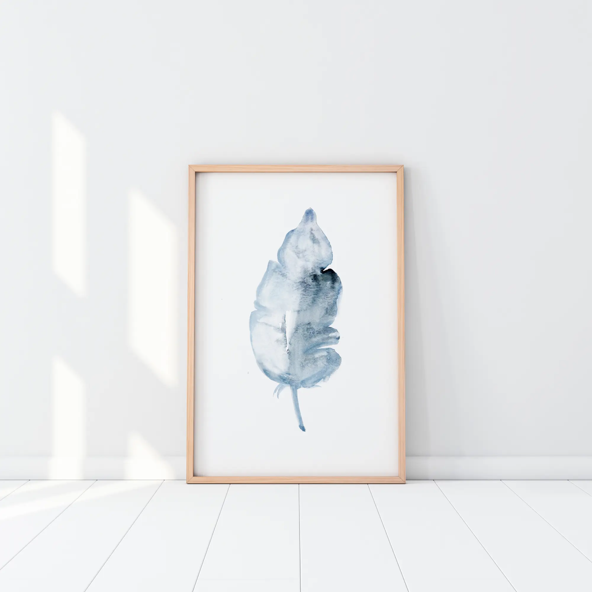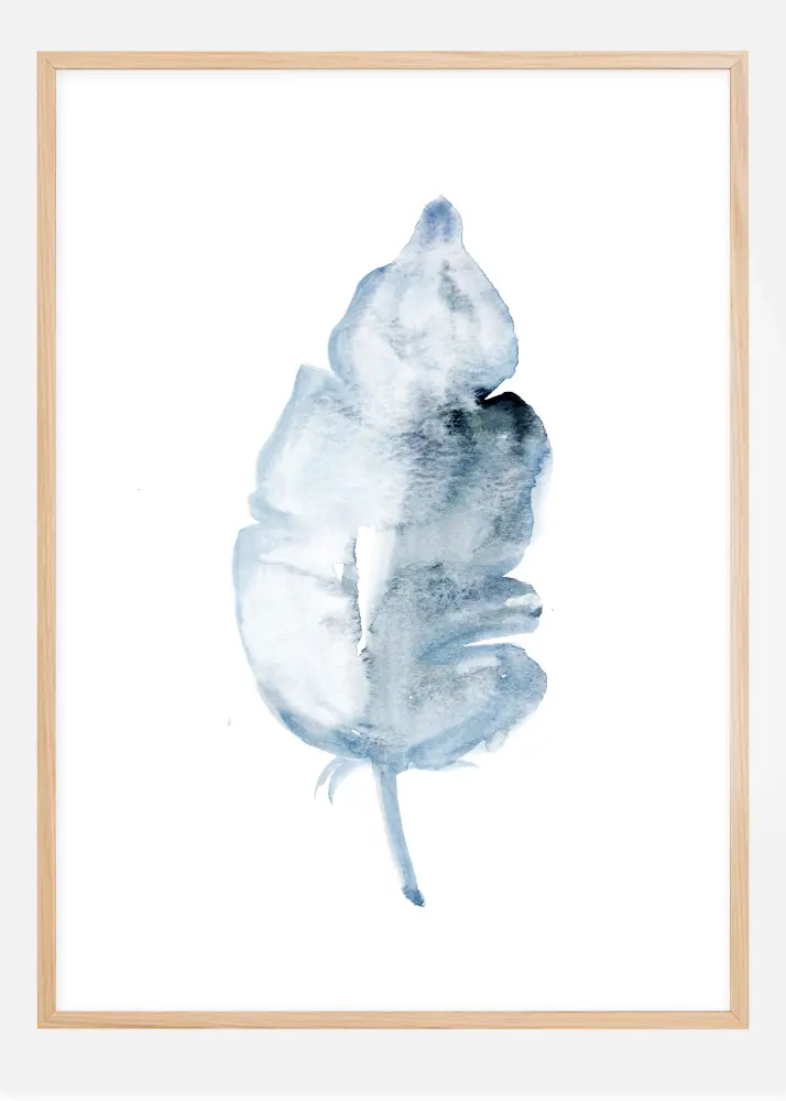 Egy szép közeli kép egy nagy halványkék tollról. A fehér háttér előtt a fény visszaverődik a toll bal oldalán, és szinte átlátszó megjelenést kölcsönöz neki. Egy minimalista poszter, amely tökéletesen illik bármilyen környezetbe.
