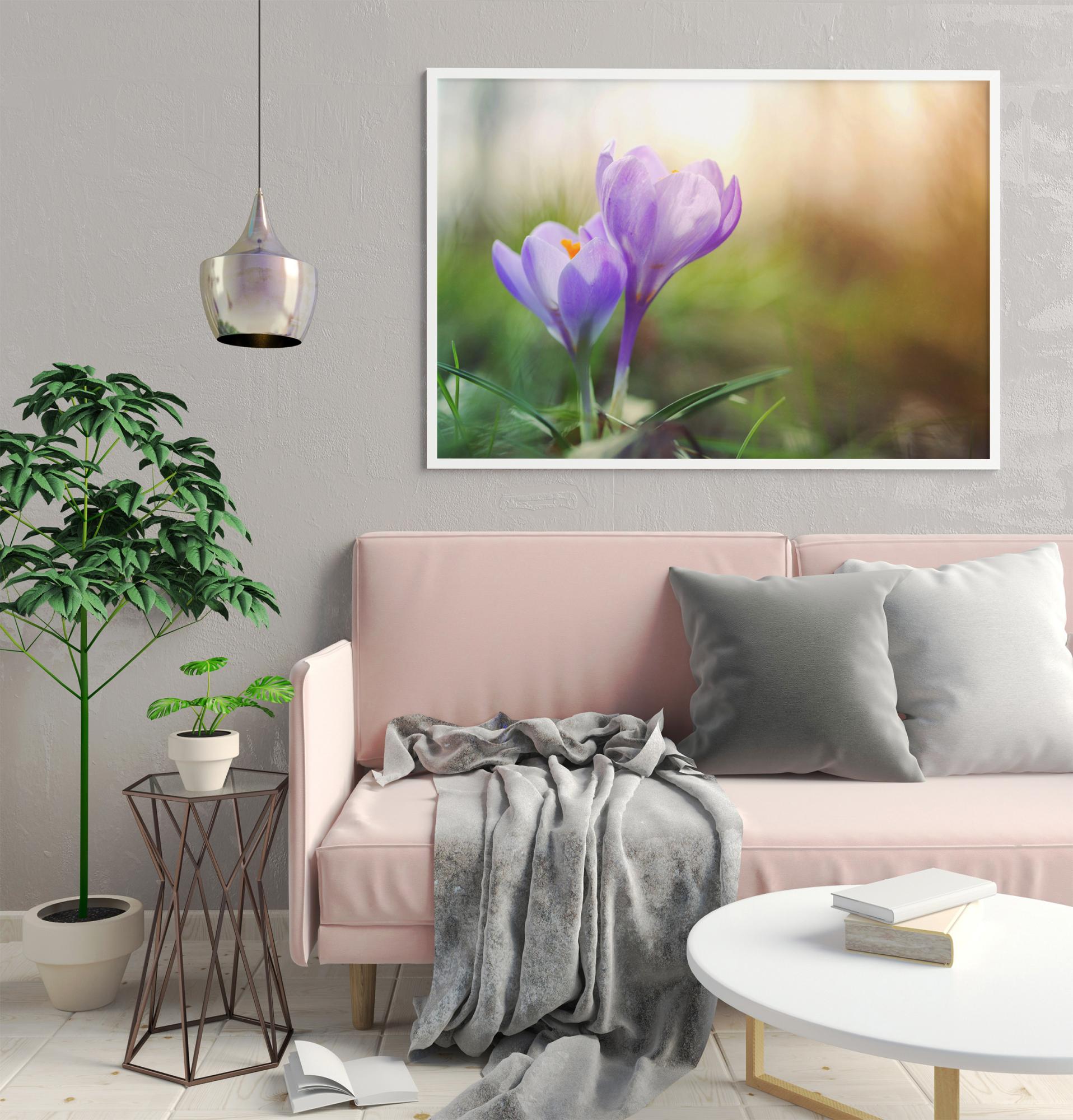 Egy bájos kép a tavasz talán legszínesebb napimádójáról, a krókuszról. A kiegészítő színben elmosódott háttér kiemeli a virágokat és harmóniát kölcsönöz a fényképnek. Tökéletes azok számára, akik színörömöt szeretnének otthonukba, és mindig szép, ha a festmény egyik árnyalatát akcentusszínként használjuk a többi berendezésben. Bátran kombinálható más növényi motívumokkal, hogy a szoba teljes érzést nyújtson.
