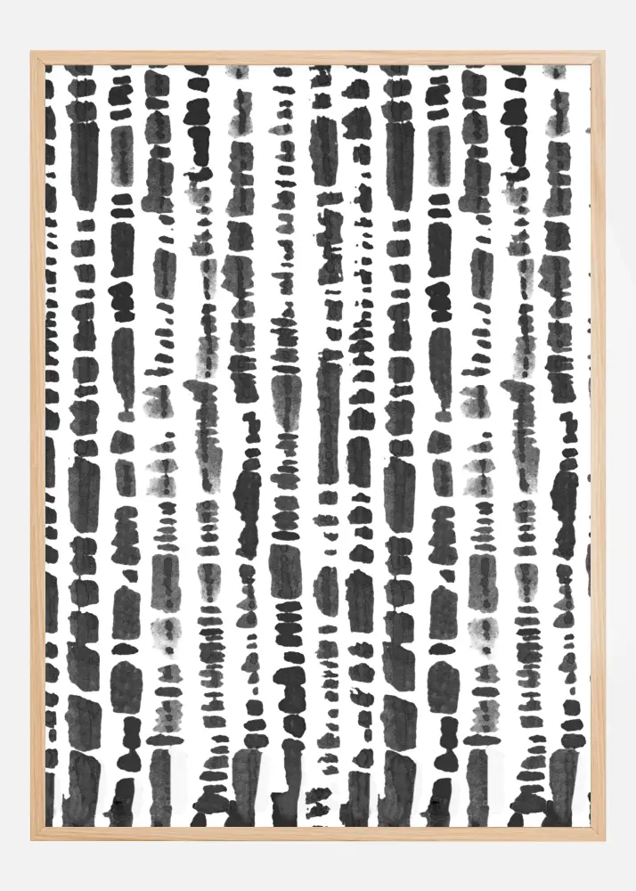 Ez az absztrakt poszter izgalmas kreativitás és spontaneitás érzését ragadja meg. A műalkotás különböző fekete és szürke árnyalatokban készült függőleges ecsetvonások sorozatából áll, amelyek véletlenszerű elhelyezkedése és hossza élénk és ritmikus vizuális textúrát hoz létre. Ez egy olyan nyomat, amely azonnal megragadja a szemet, és kortárs dinamikát kölcsönöz bármely helyiségnek.