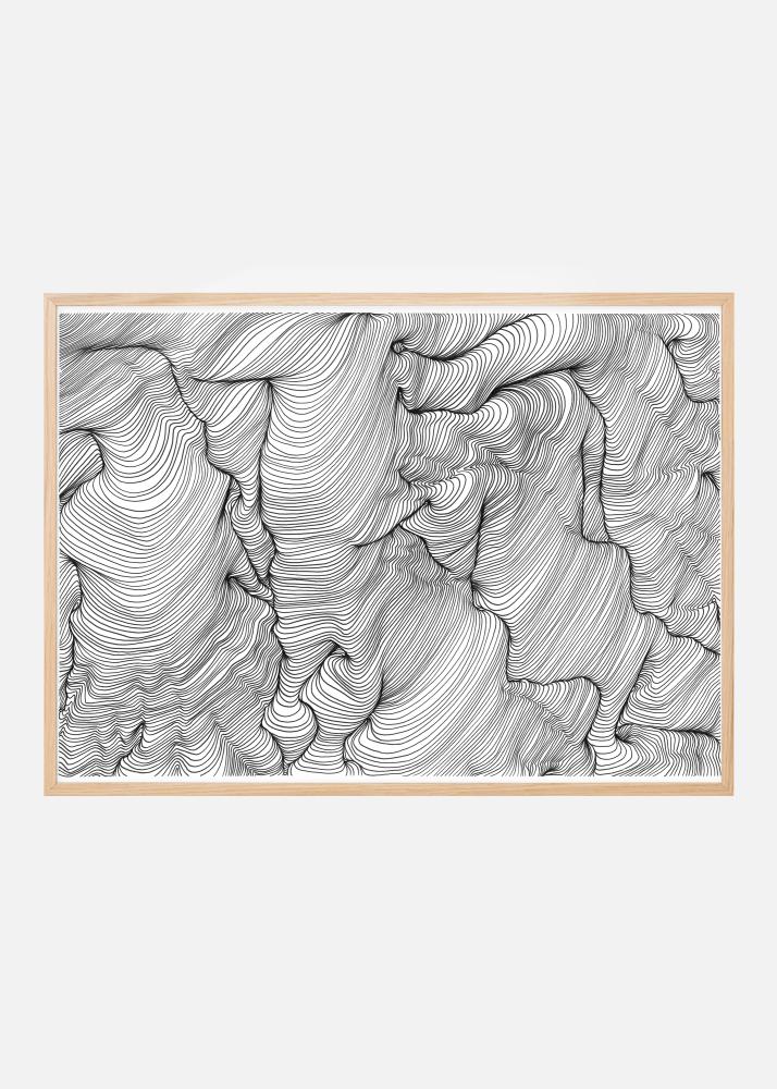 Egy absztrakt művészeti poszter fekete tintában, hullámos vonalakkal, amelyek izgalmas formákat hoznak létre, Belinda Hellberg, Hells Bells Sthlm alkotása. A motívumot egy kissé vékonyabb fehér keret veszi körül, amely hatékonyan kiemeli annak tartalmát. Egy egyszerű és elegáns poszter, amely könnyen kombinálható más kedvencekkel egy nagyobb képfalon.