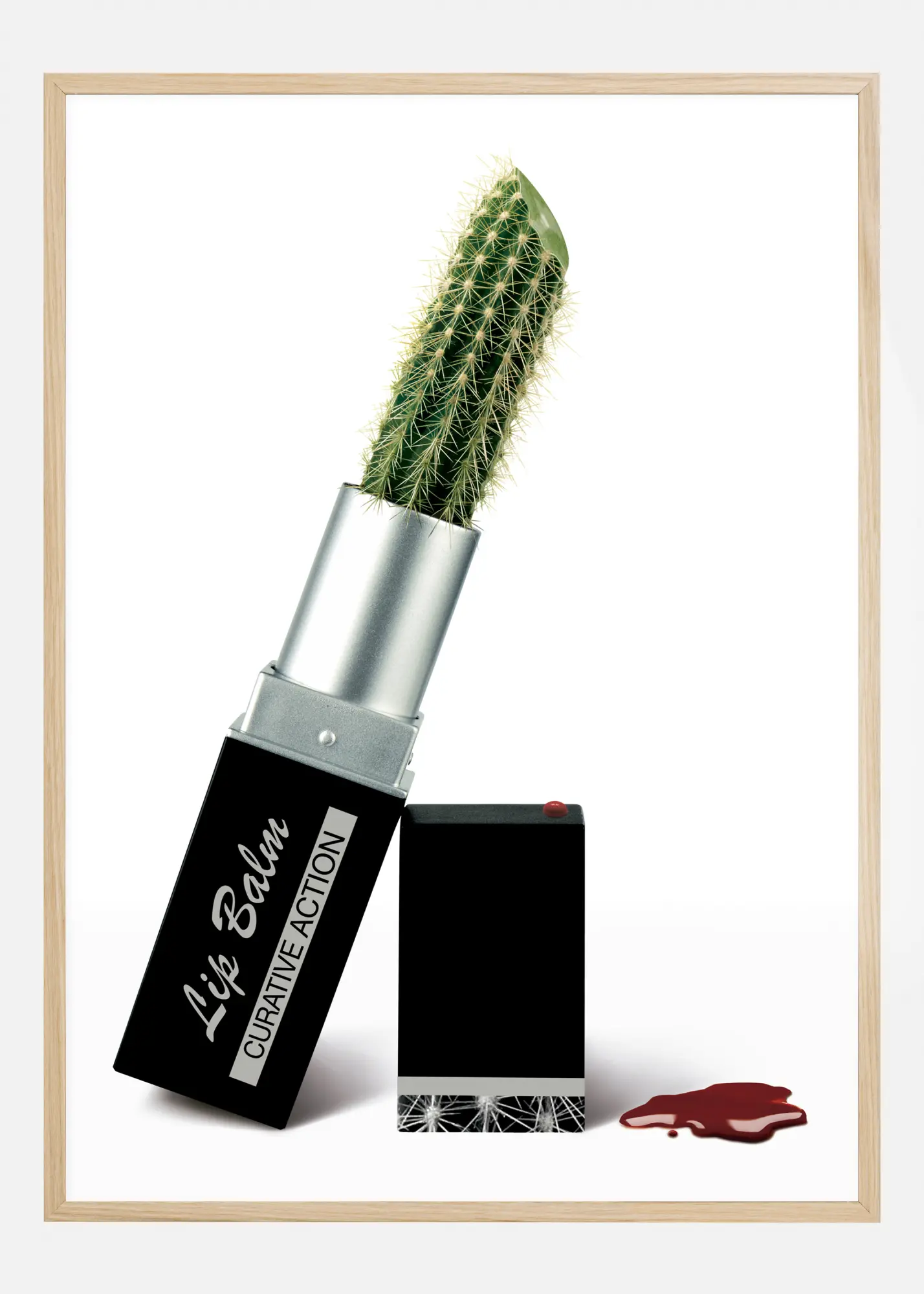 Egy fájdalmas, de szórakoztató poszter szépségápolási termékekkel. Fehér háttér előtt egy fekete-fehér rúzs található kaktusz formában. A rúzs tetejére döntve egy magányos piros csepp és egy piros fröccsenés van a teteje mellett. Légy óvatos, amikor felrakod a rúzsodat.