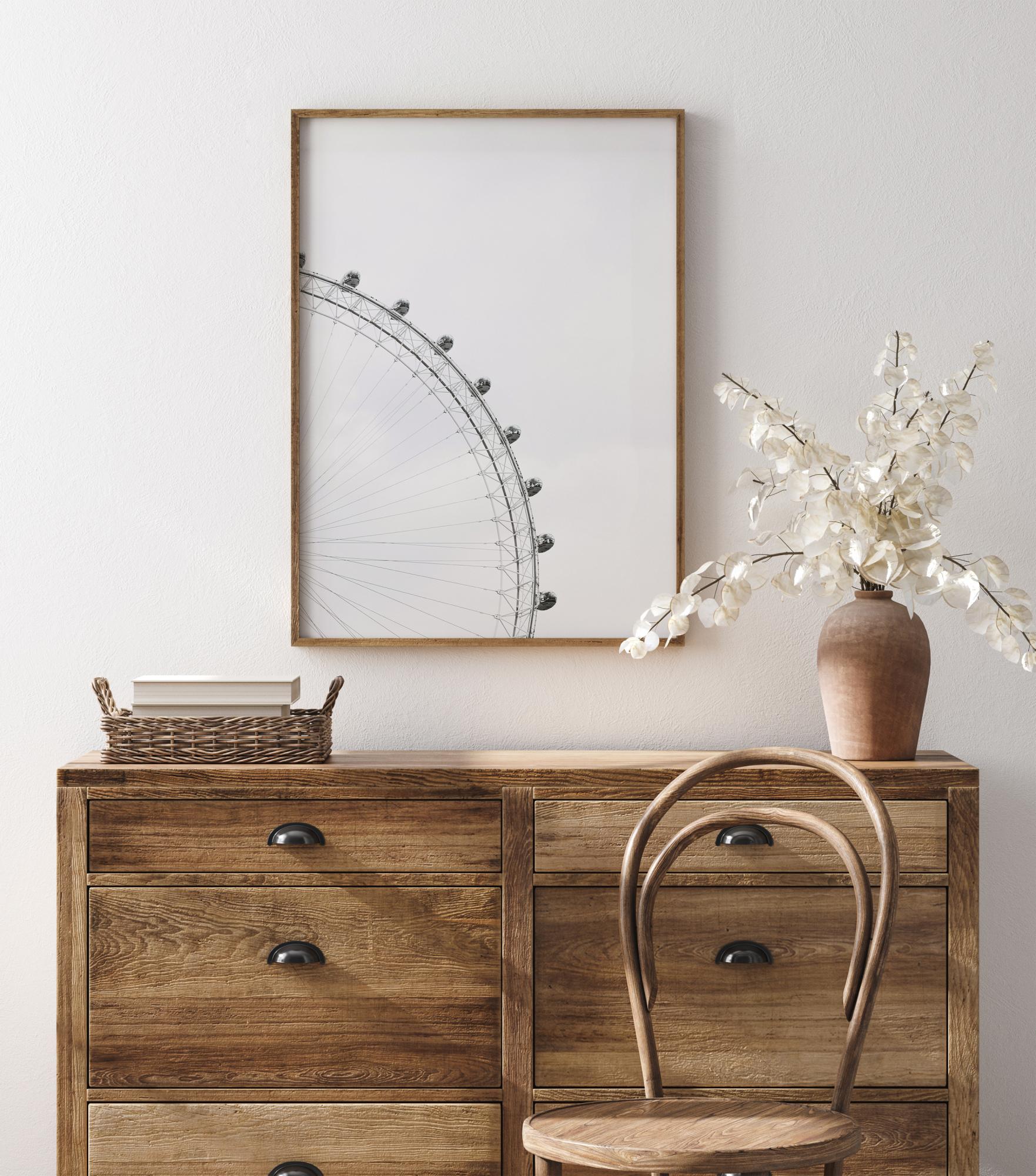 Egy lenyűgöző fekete-fehér nyomat a London Eye-ról. A szürke londoni égbolt hátterében a kerék küllői a kilenc utaskabinra irányítják a tekintetet. Egy valóban lenyűgöző poszter, amely kiemeli ezt a nagyszerű műszaki építményt. Képzeld el a kilátást az egyik ilyen kabinból.