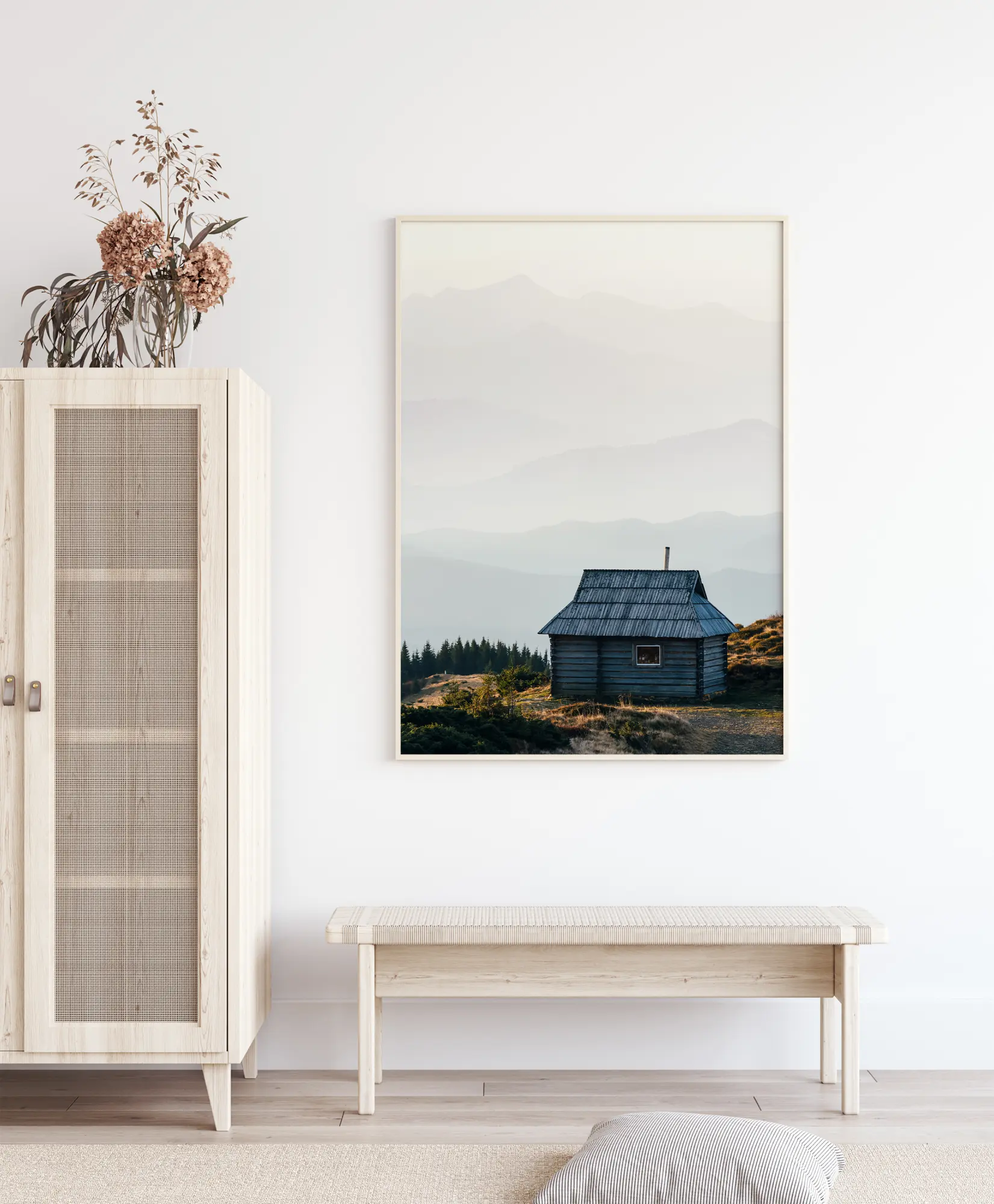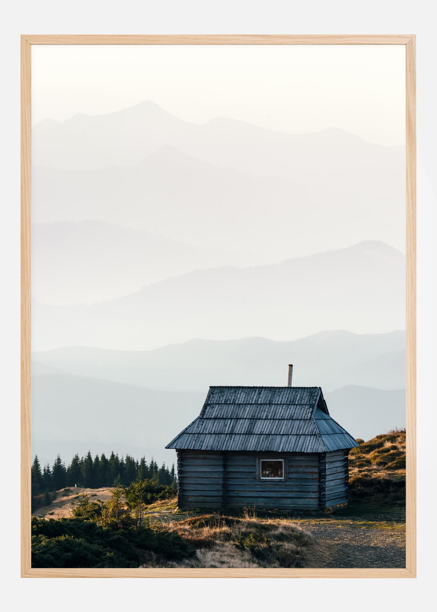 Egy egyszerű, kis kék házikó egy hegycsúcson. A távoli dombok a ködös háttérben varázslatos képet teremtenek. A házikó bal oldalán a sötétzöld fenyők extra színt adnak ennek az egyszerű, de gyönyörű poszternek. Tegye fel egy világos falra, hogy térérzetet adjon.