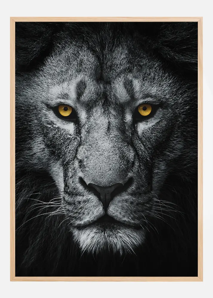 Ez a merész és ösztönző poszter az oroszlán portréját ábrázolja lenyűgöző részletességgel. A kép fekete-fehér, kivéve az oroszlán szemeit, amelyek erős és élénk sárga színben ragyognak, ellenállhatatlan fókuszpontot teremtve a motívumban. A színek és a kontraszt átgondolt használata intenzitás és jelenlét érzését adja, amely megragadja és megtartja a néző figyelmét. Ez a poszter tökéletes azoknak, akik a vad és természetes erő érzését keresik belső tereikben.