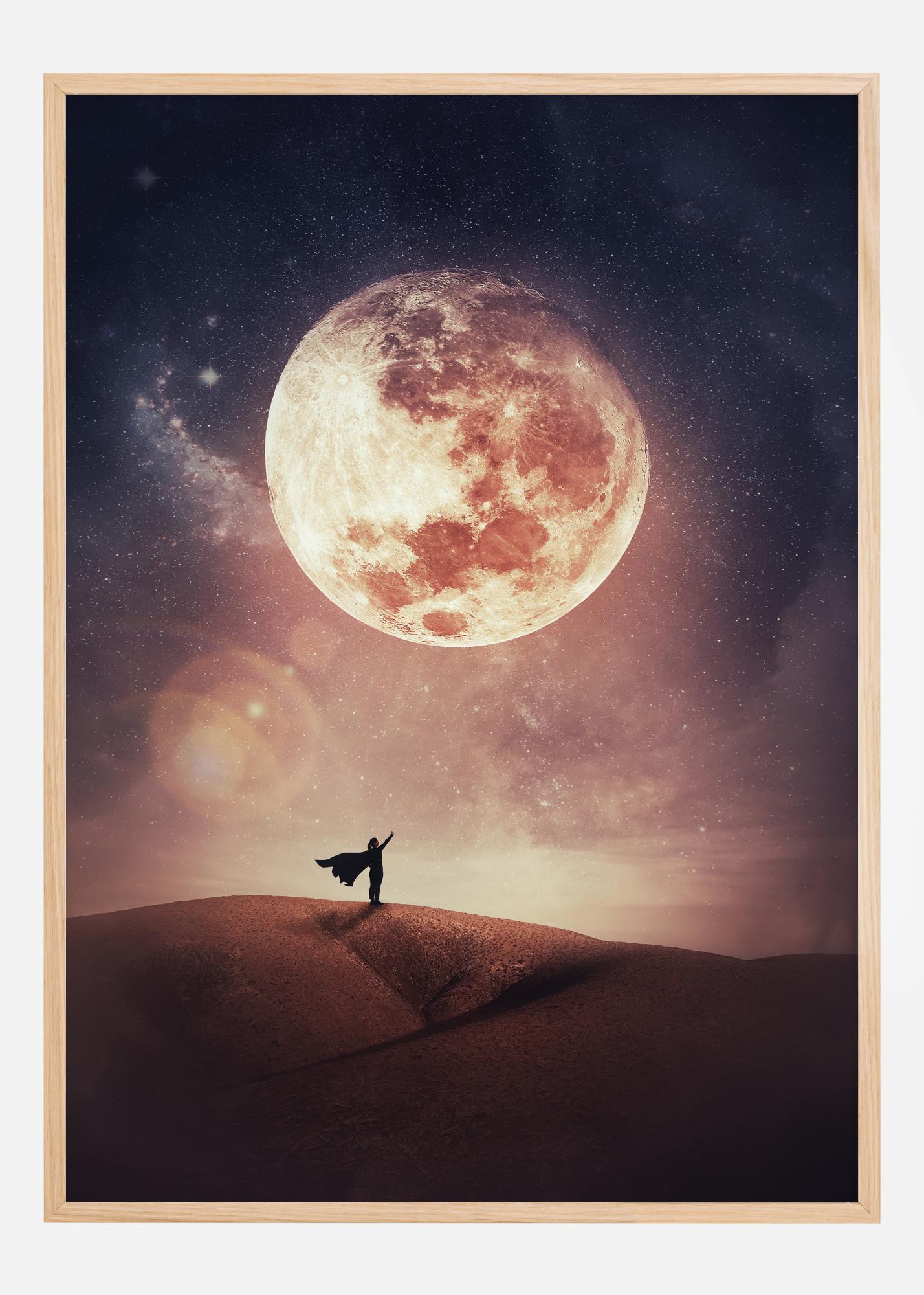 Ez az álomszerű poszter egy varázslatos pillanatot ragad meg, ahol egy magányos alak áll egy sivatagi dombon, és felnéz az óriási, ragyogó holdra, amelyet csillagokkal díszített égbolt vesz körül. A jelenet erőteljes emlékeztető arra, hogy hol a helyünk az univerzumban, mind jelentéktelen, mind pedig bámulatos. Vágyakozást és kíváncsiságot ébreszt, arra inspirál, hogy nagyban gondolkodjunk és határok nélkül álmodjunk.
