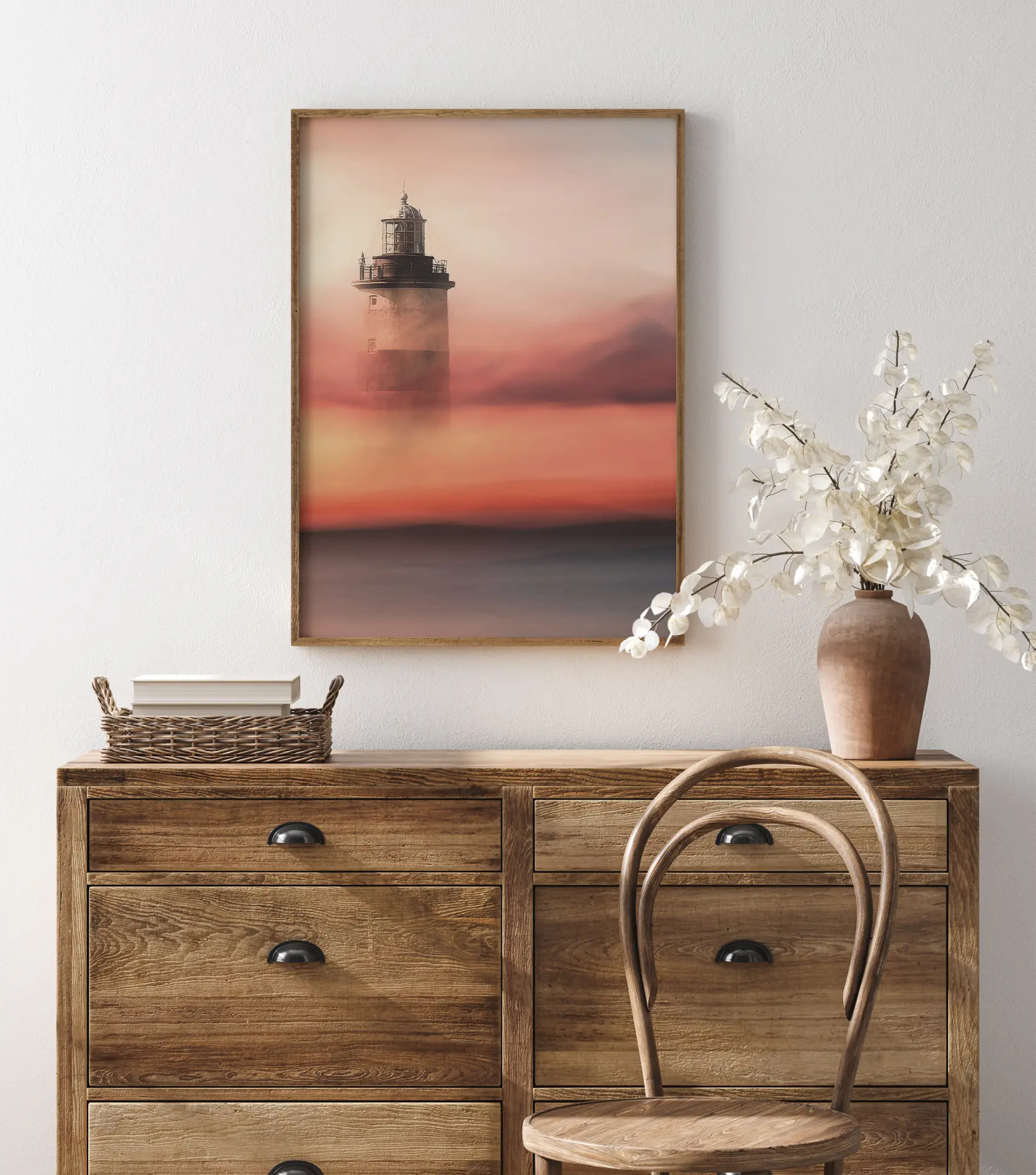 Egy gyönyörű romantikus nyomat egy világítótoronyról a tengeri ködben. A lágy, rózsaszín pasztell színek romantikus érzetet keltenek, míg a lágy kékes tenger sötétebb árnyalatot ad ennek a gyönyörű poszternek. Érezd és halld a tengeri szellőt, amikor ezt a képet az otthonodban felakasztod.