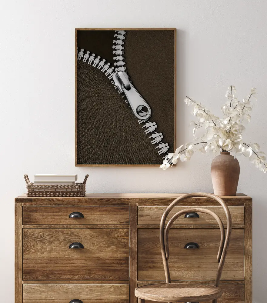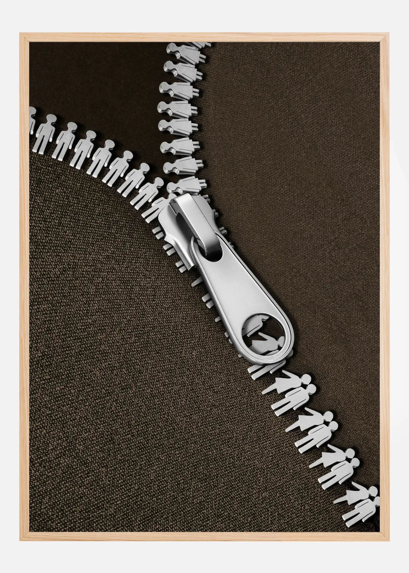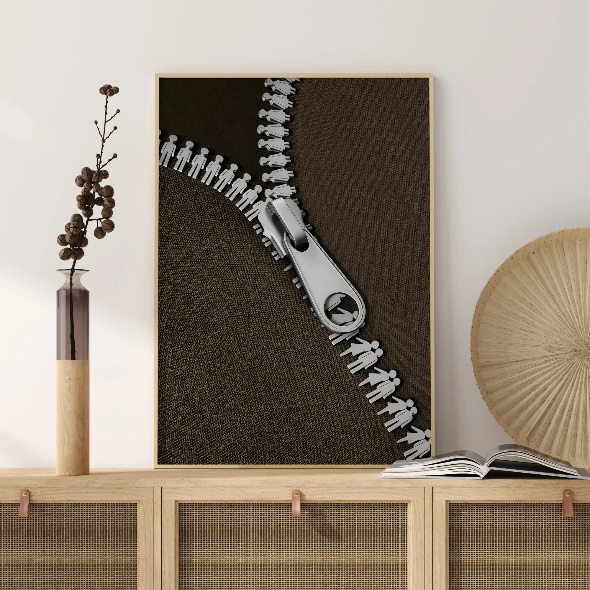 Egy minimalista nyomat egy ezütszínű cipzárról. Az ezütszínű cipzár fekete háttéren két szerelmest ábrázol, akik találkoznak. Egy sötétbarna anyagon az ezütszínű kapocs lóg a cipzár figurái felett. Egy vicces poszter mindenki számára, aki érdeklődik a divat iránt.