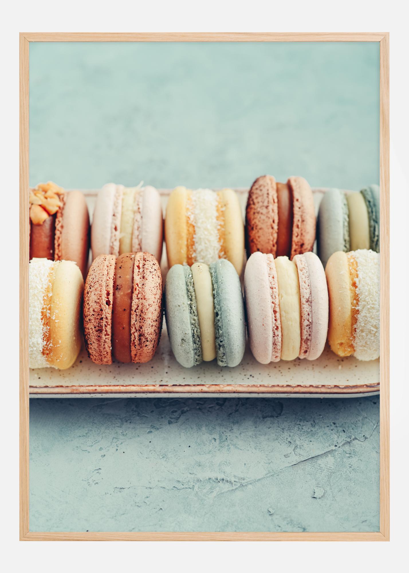 Ez a színes és étvágygerjesztő poszter finoman elrendezett macaronokat ábrázol, melyek változatos színei és textúrái vizuális élményt teremtenek. A lágy pasztellszínek a halvány citromtól a gazdag karamellig és púderes rózsaszínig terjednek, minden macaron részletekkel, mint például cukorszórás és kókuszreszelék kiemelve, fokozva megjelenésüket és feltételezett ízüket.