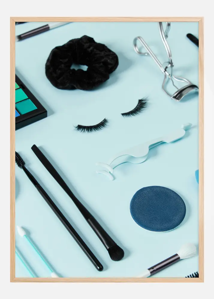 A színpalettát a lágy és megnyugtató kék árnyalatok uralják, amelyeket fekete és ezüst egészít ki, így friss és kortárs megjelenést kölcsönöz. A sminkecsetek, a szempillagöndörítő és a műszempilla valósághű részletei szépen kontrasztálnak a minimalista háttérrel, és a fekete hajgumi struktúrája érdekes vizuális elemet ad. Ez a nyomat kiváló kiegészítője lesz a fürdőszobának, a fésülködőasztalnak, vagy bármilyen helynek, ahol a szépség és a stílus a legfontosabb. Tökéletes arra, hogy inspirálja és megszépítse napi szépségápolási rituáléját.