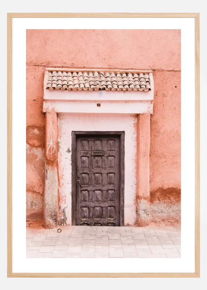 Egy gyönyörű barack- és barnaszínű nyomat egy barna faajtóról. A marokkói ház gyönyörű barackszínre van festve. Az ajtót körülvevő fehér fal extra világosságot kölcsönöz a portrénak. Akaszd ezt a gyönyörű barackszínű posztert egy bézs falra, hogy harmóniát teremts.