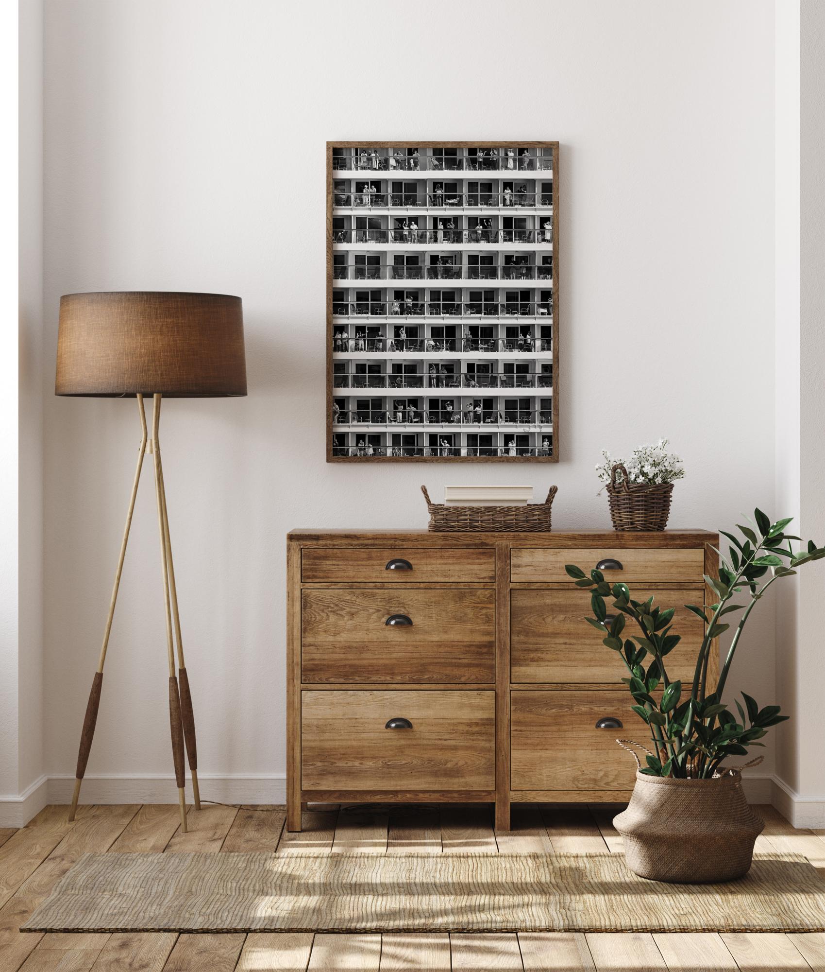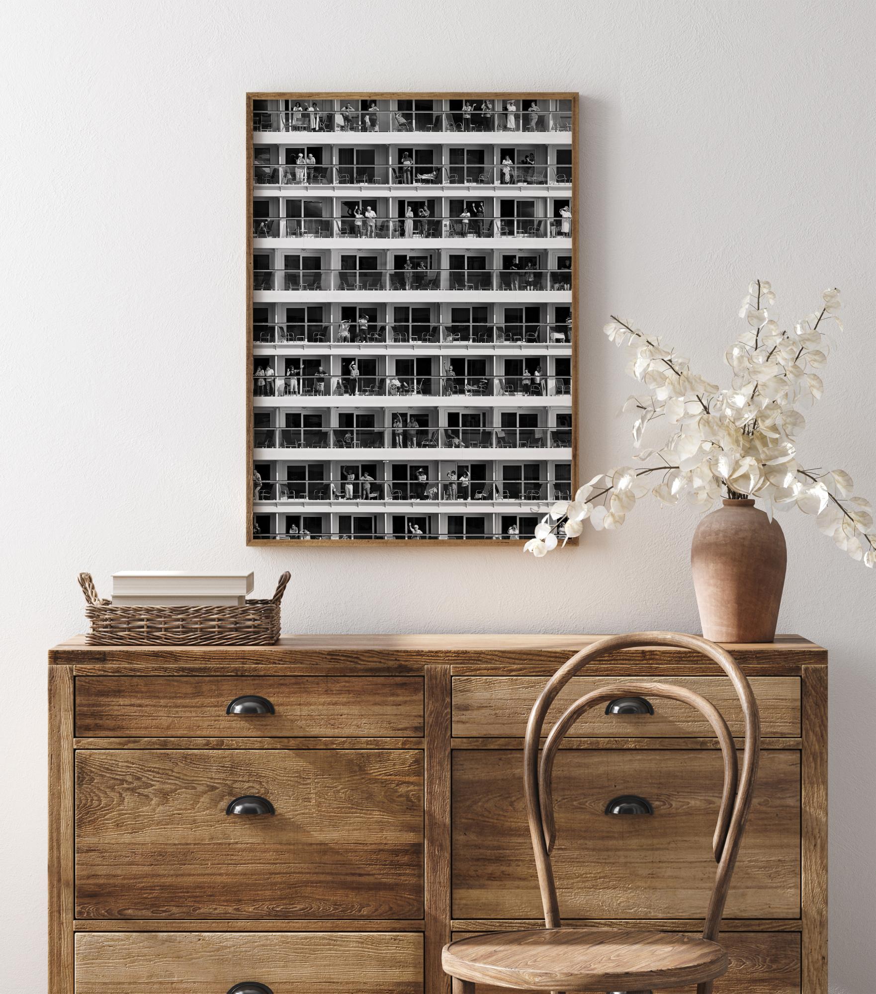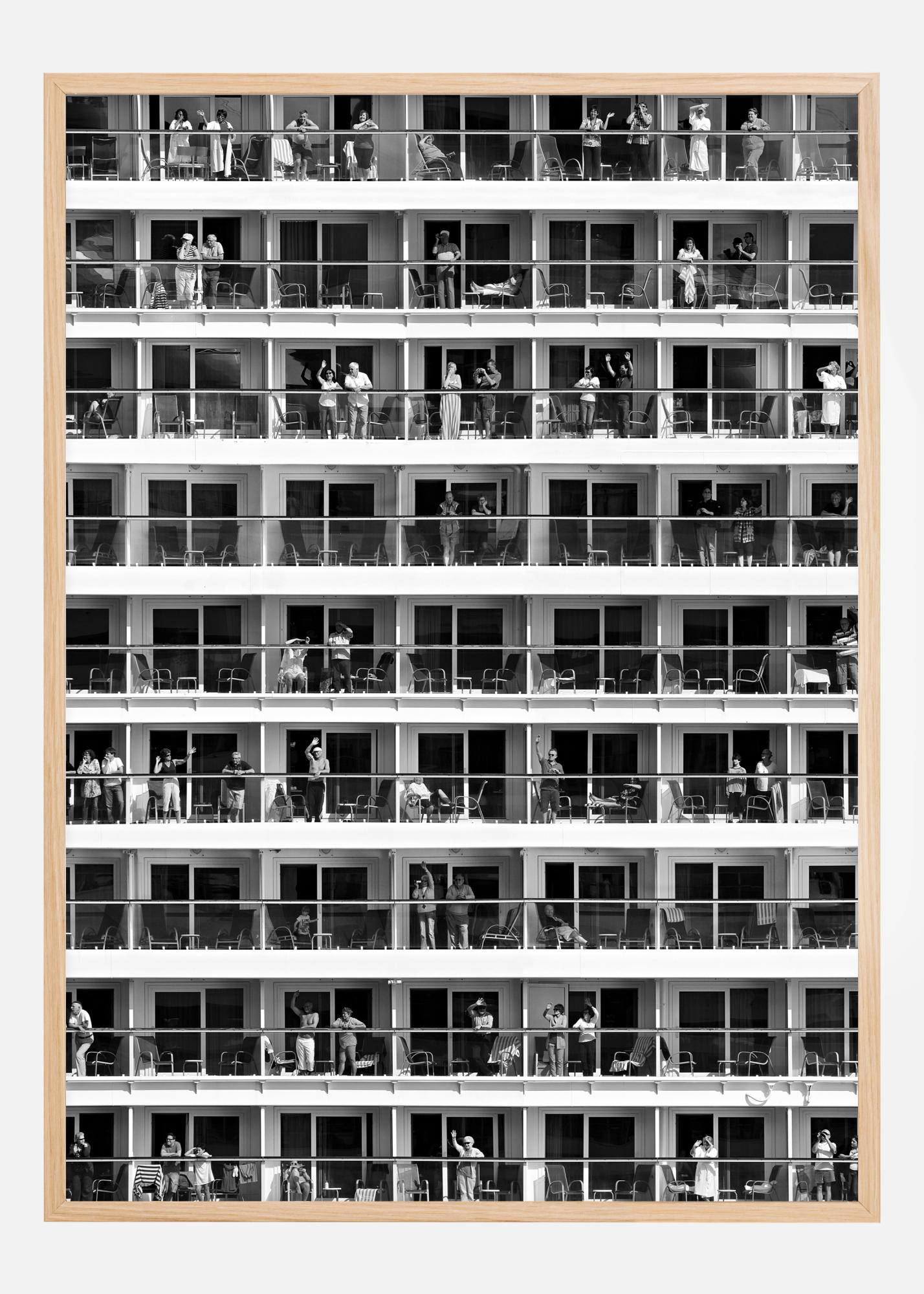 Egy geometrikus utazási poszter, amelyen erkélysorok és a napfényt élvező emberek láthatók. Érezd a szeretetet, amikor visszaintegetsz minden barátságos arcnak ezen a képzeletbeli turisztikai képen.