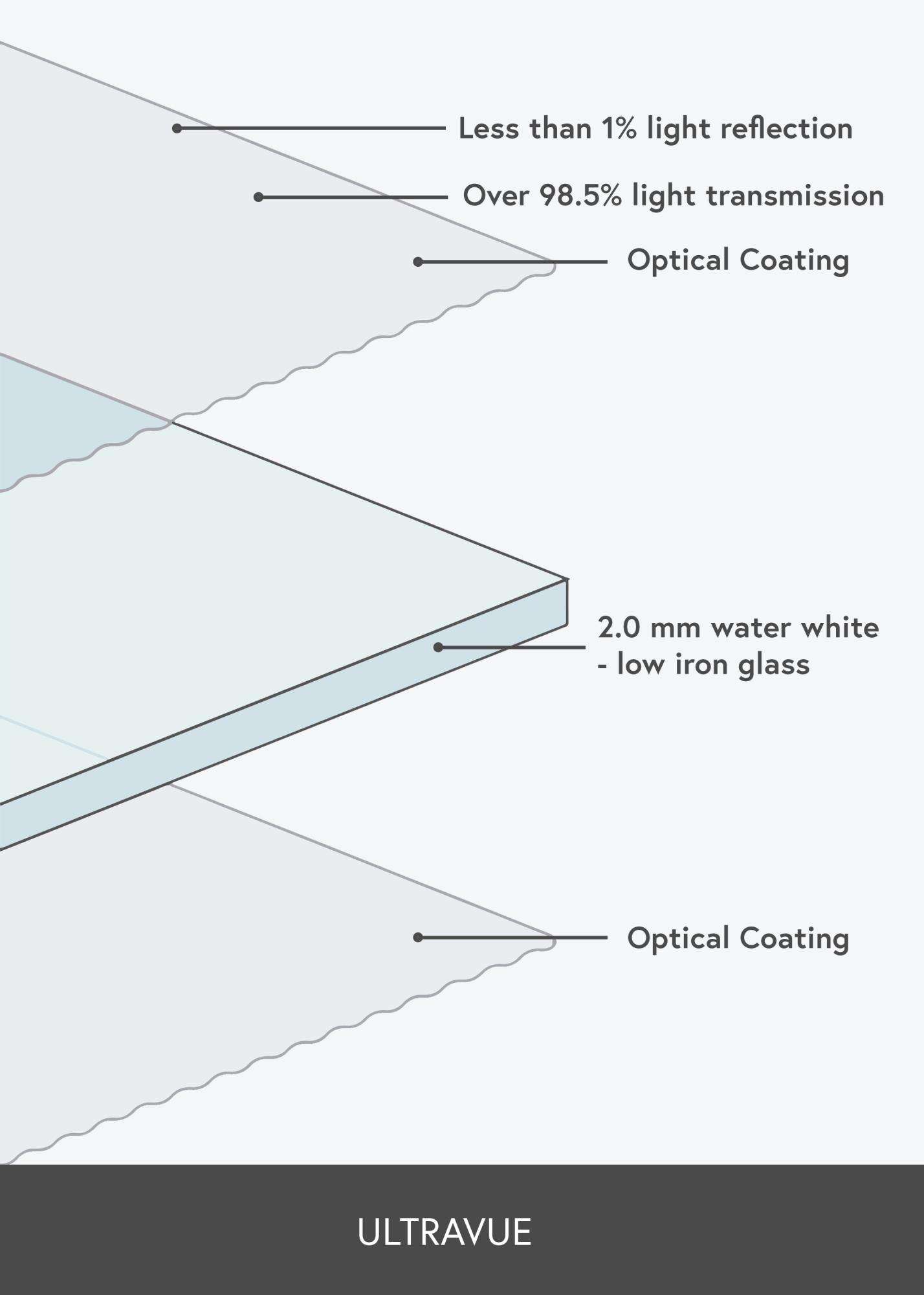 Kerüld el a zavaró tükröződéseket és visszaverődéseket egy valódi tükröződésmentes üveggel a Tru Vue-től. Mindössze 1%-os visszaverődési arányával az üveg szinte láthatatlan, és természetes színeket és valódi fényt kölcsönöz képeidnek. Ráadásként az üveg UV-védett is, és eltávolítja a káros UV-sugarak 70%-át, így a képeid hosszú ideig megmaradnak. Az UltraVue karcálló is.