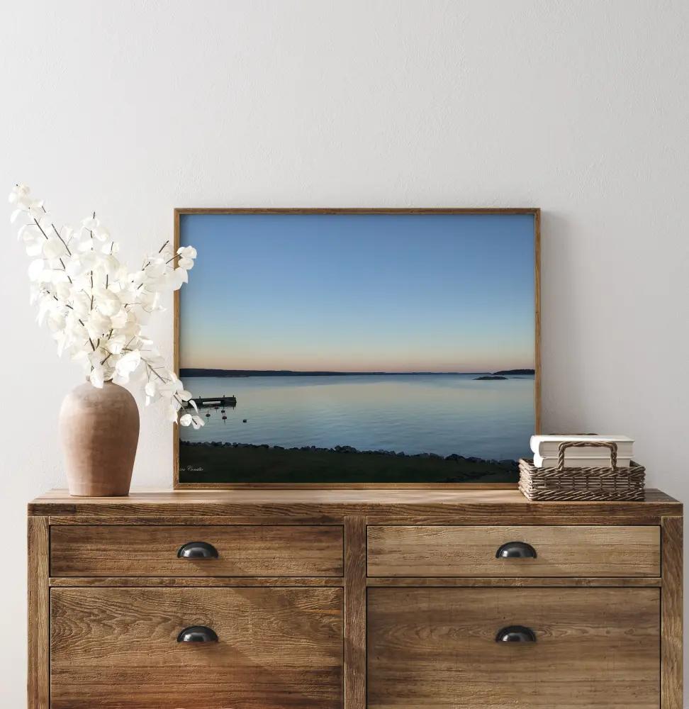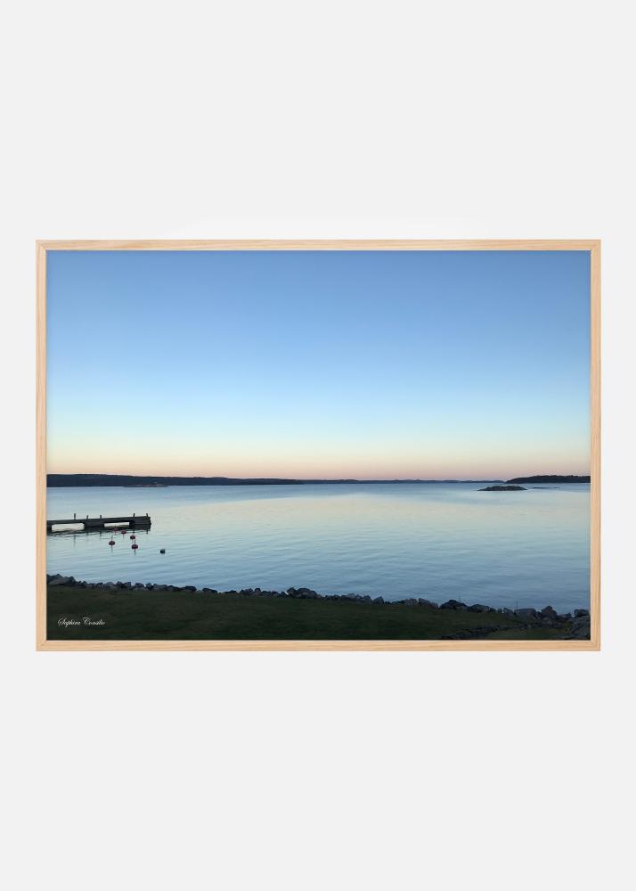 Egy fotóposzter a svéd szigetvilágról, szigetekkel és zátonyokkal a gyönyörű naplementében. Egy stég a mellette lévő úszóbójákkal egy kis extra életet ad a képnek. Egy csodásan megnyugtató poszter, amelyet Saphira Consilio fotós készített.