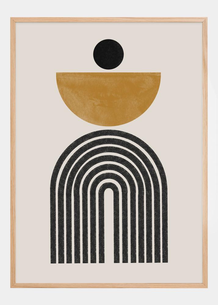 Merüljön el az absztrakció és szimmetria világában modern poszterünkkel, amely fekete-fehér ívek sorozatát ábrázolja egy napszerű aranyszínű félkör alatt, amelyet egy fekete kör koronáz meg. Ez a nyomat a modern művészet tisztaságának és a geometriai dizájn egyszerűségének ódája, amely kifinomult érintést ad a belső térnek. A színek merészen redukáltak, hogy kiemeljék az egyes formák kontrasztját és vizuális súlyát.