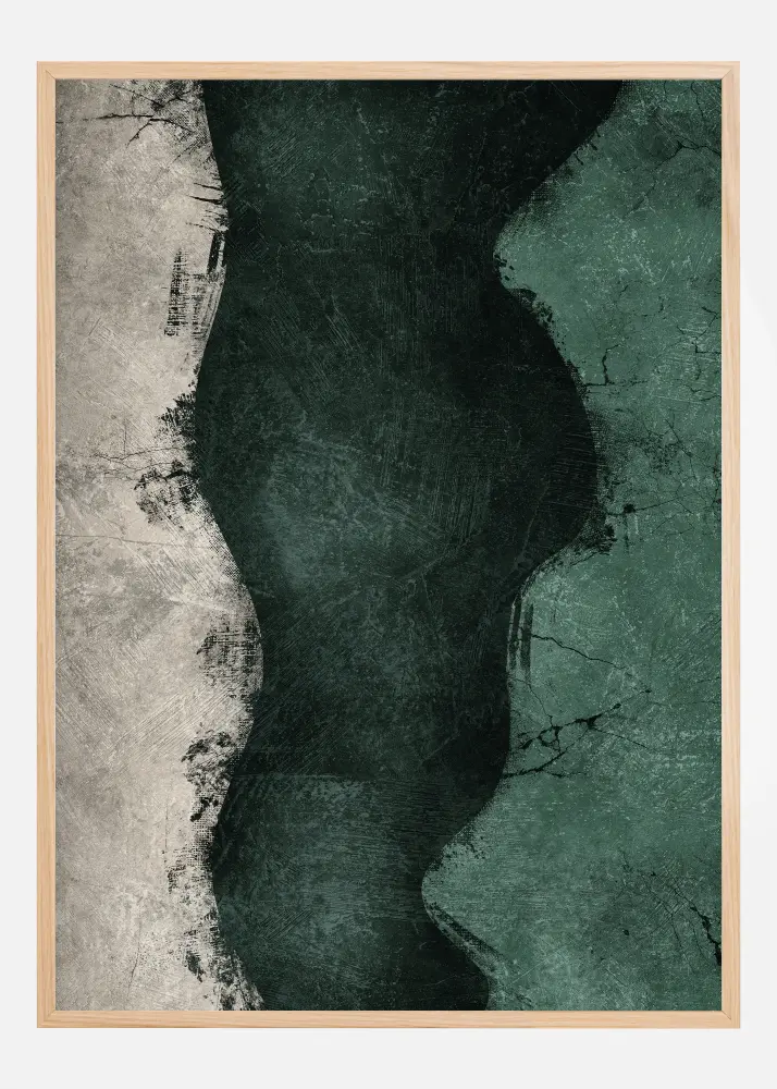 Ez a poszter erős vizuális hatást kelt a texturált formák megosztott kompozíciójával, amely egy sötét táj vagy két világ közötti szakadék légifelvételére emlékeztet. Az egyik oldal intenzív zöld árnyalatot mutat mély textúrákkal, a másik pedig egy halványabb kontrasztos árnyalatot, amelyek együtt a természet dinamikus kontrasztját sugallják az erdő és a nyílt terület között. Ez egy drámai és magával ragadó kép, amely az árnyékokkal és a fényekkel játszik, misztériumot és elragadtatást teremtve.