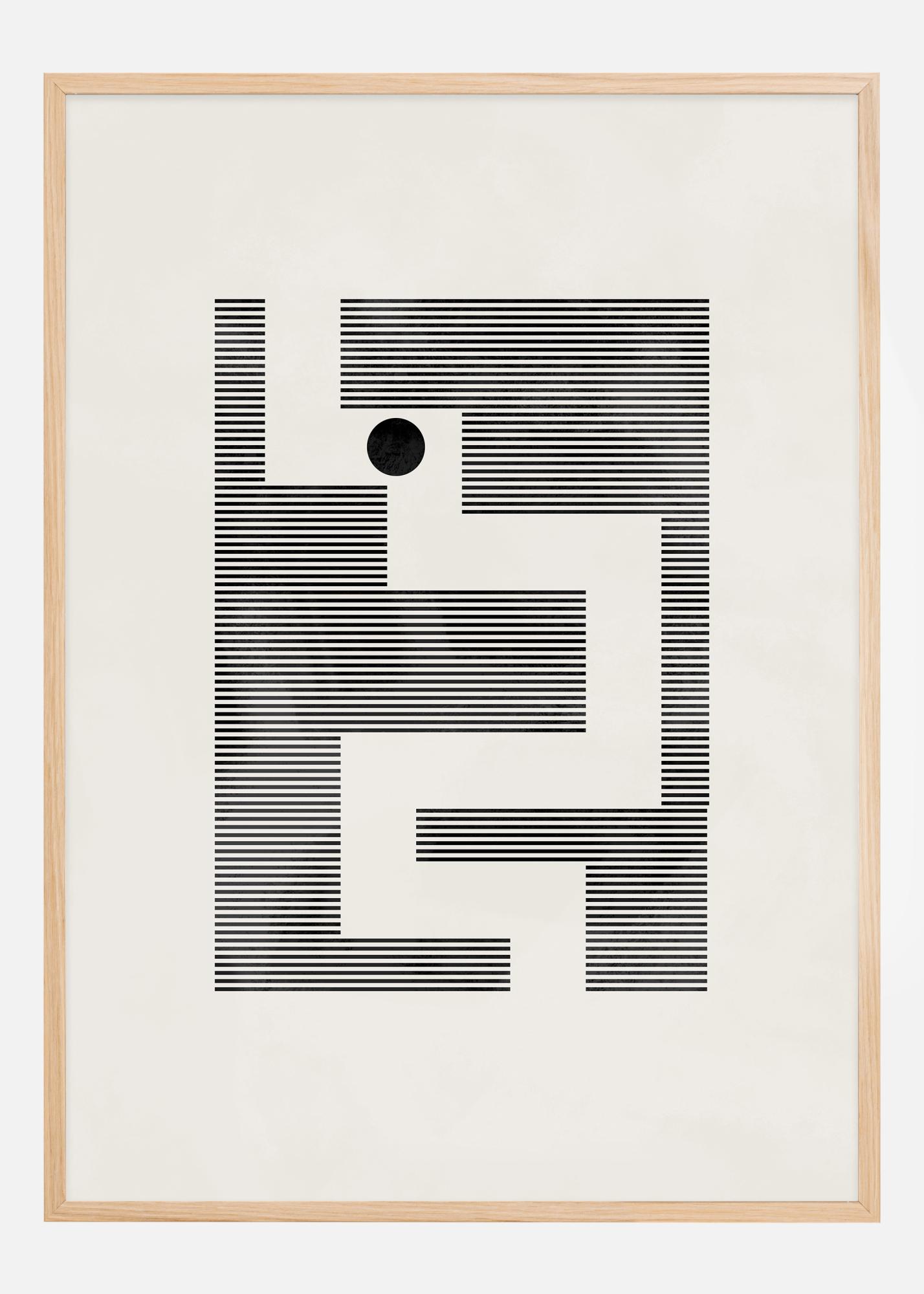 Ez a művészi poszter egy minimalista labirintusértelmezést kínál, fekete vonalakkal, amelyek bonyolult szövetet alkotnak geometriai formákból, krémszínű háttér ellenében. Az egyedülálló fekete kör a labirintus közepén vizuális horgonypontként működik, miközben mélységet és fókuszt ad az egyébként egyszerű motívumnak. Ez a design játszik a néző szemével, és bátorítja a vizuális felfedezést az útjain és holtpontjain.