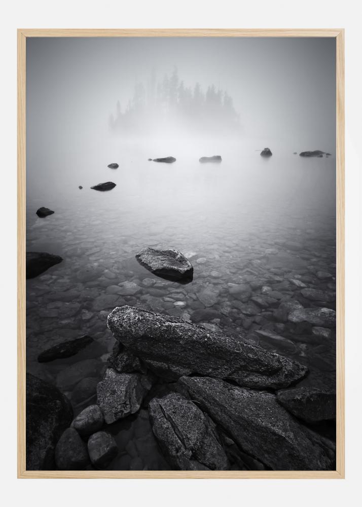 Egy titokzatos természetposzter kövekkel és ködös tóval. Képzeld el, mi található ott, amikor a ködös fás szigetre nézel. Varázsolj bűvöletet otthonodba ezzel a csodálatos nyomattal egy kék falon.