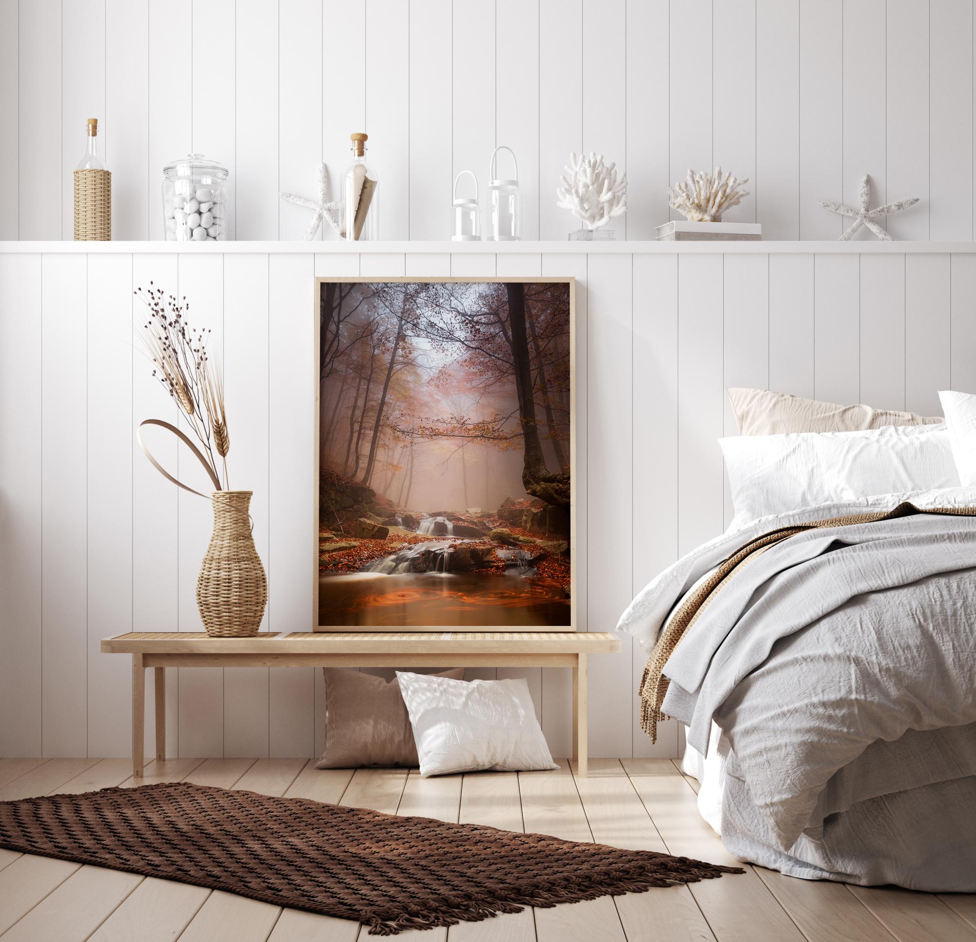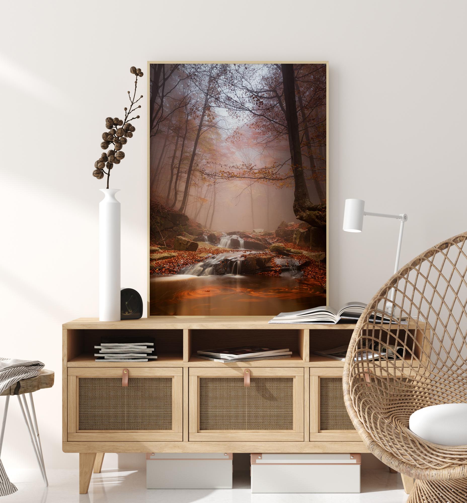 Egy festői portré egy ködös erdőről, amelyben egy gyönyörű patak található. A köd blokkolja a közvetlen napfényt, és csak néhány sugár világítja meg a ködös erdőt, kiemelve a barna és sárga leveleket. Az előtérben őszi színű levelek hevernek a folyóparton. Ez a poszter készen áll arra, hogy természetközeli és sziklás erdei kilátást adjon otthonának.