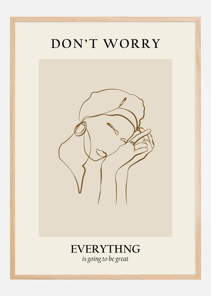 Ez a művészi poszter egy csendes pillanatot örökít meg a reflexió és belső béke képében, egy vonalrajzon keresztül, amelyen egy személy a kezét az arcához emeli. A "DON'T WORRY" szöveg nagy betűkkel túllép a képen, nyugtató emlékeztetőt nyújtva, míg az "EVERYTHING is going to be great" gondolatébresztő hangvétellel hangsúlyozza az üzenetet. Ez a modern műalkotás tökéletes arra, hogy nyugalmat és optimizmust sugározzon otthon vagy az irodában.
