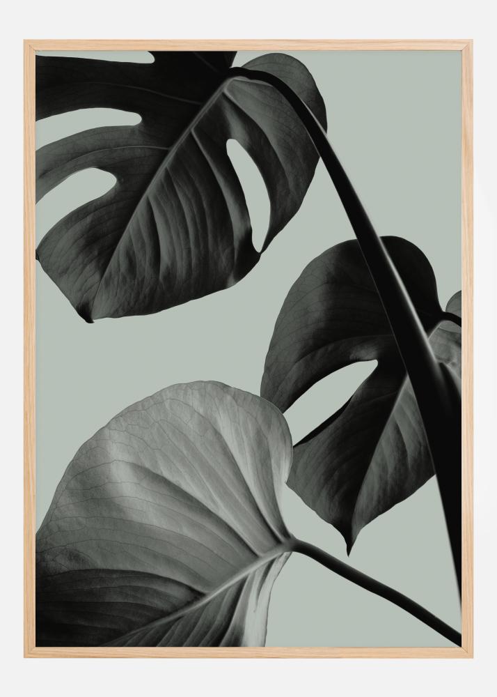 Egy fantasztikus fekete-fehér közeli poszter három monstera levéllel, amelyek szív alakjukkal feszülnek rá a matt szürke háttérre. A fűrész alakú levelek szem alakú formákkal rendelkeznek, amelyek tökéletes vadságot kölcsönöznek nekik. Varj izgalmas hangulatot otthonának, mivel a szem alakú formák kissé rémisztőek.